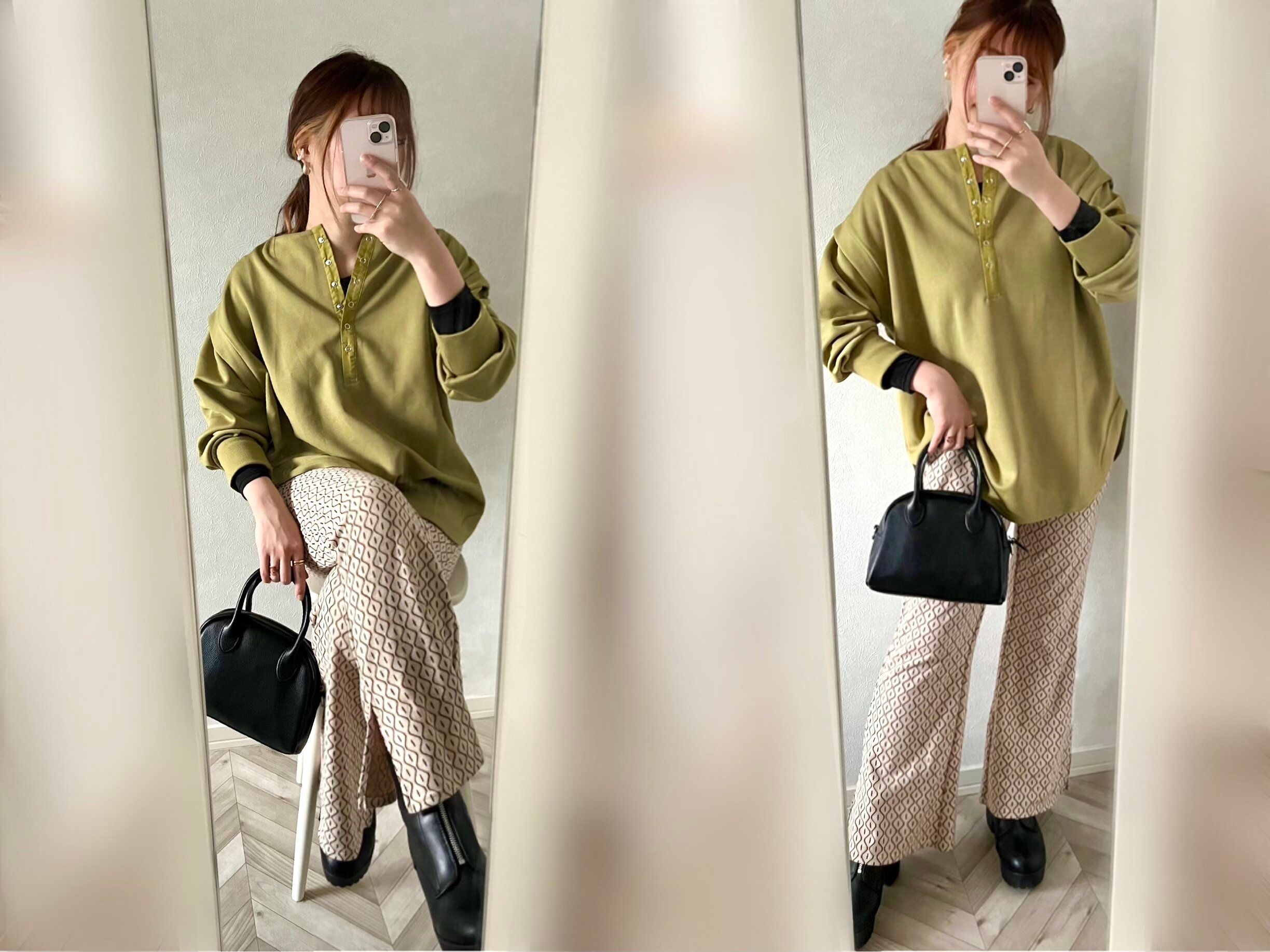 小物と足元はブラックに統一しています。