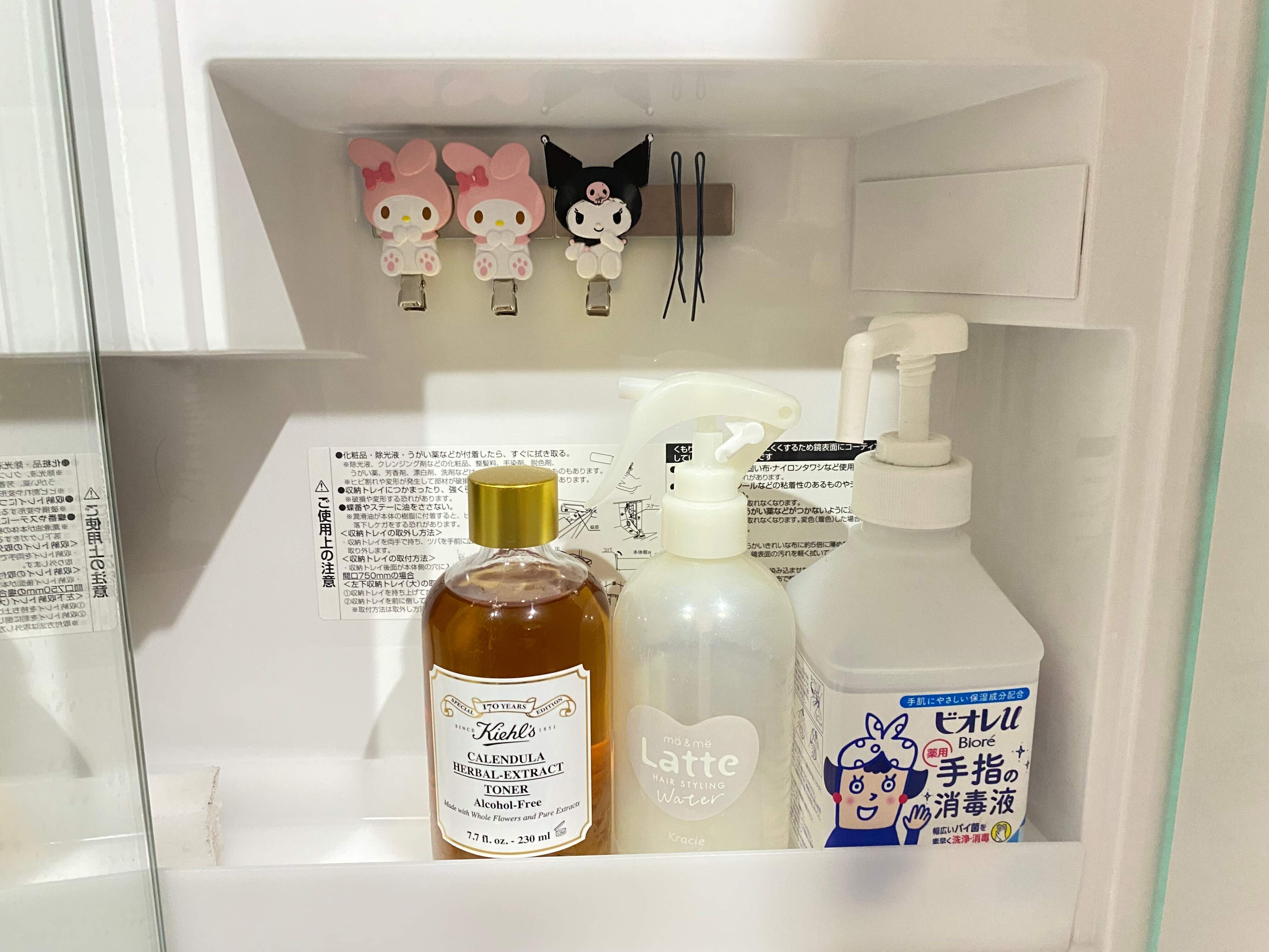 我が家は洗面所の鏡裏収納スペースに化粧水や消毒などを置いていますが壁との間にスペースが空いていたのでそちらに2つ付けてみました!