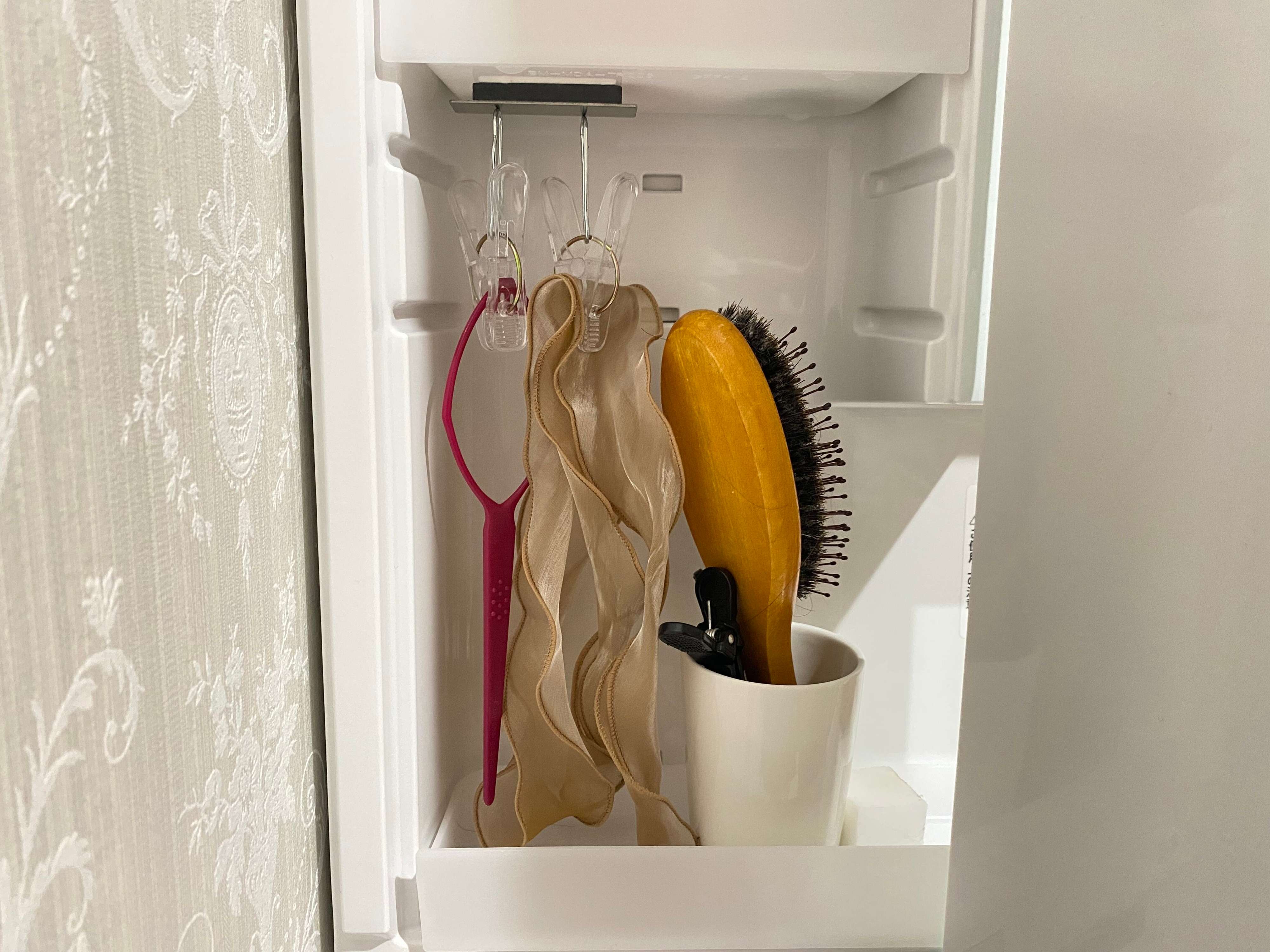 棚の天井部分にステンレスホルダーを貼り付けて、家にあったステンレス付きの洗濯バサミをつけ、そこにヘアアレンジグッズやリボンをぶら下げてみました!
