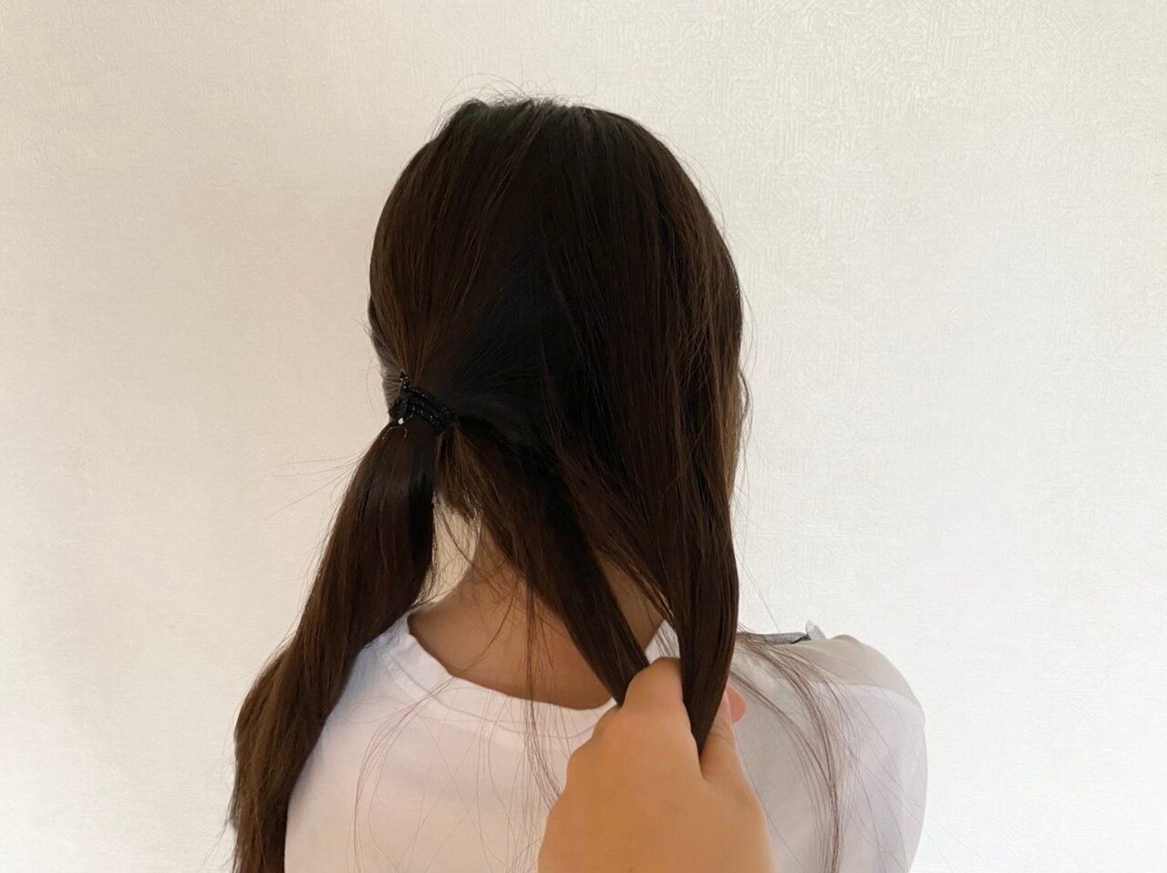 3.右側の束と左から3番目の毛束をゴムで結びます。