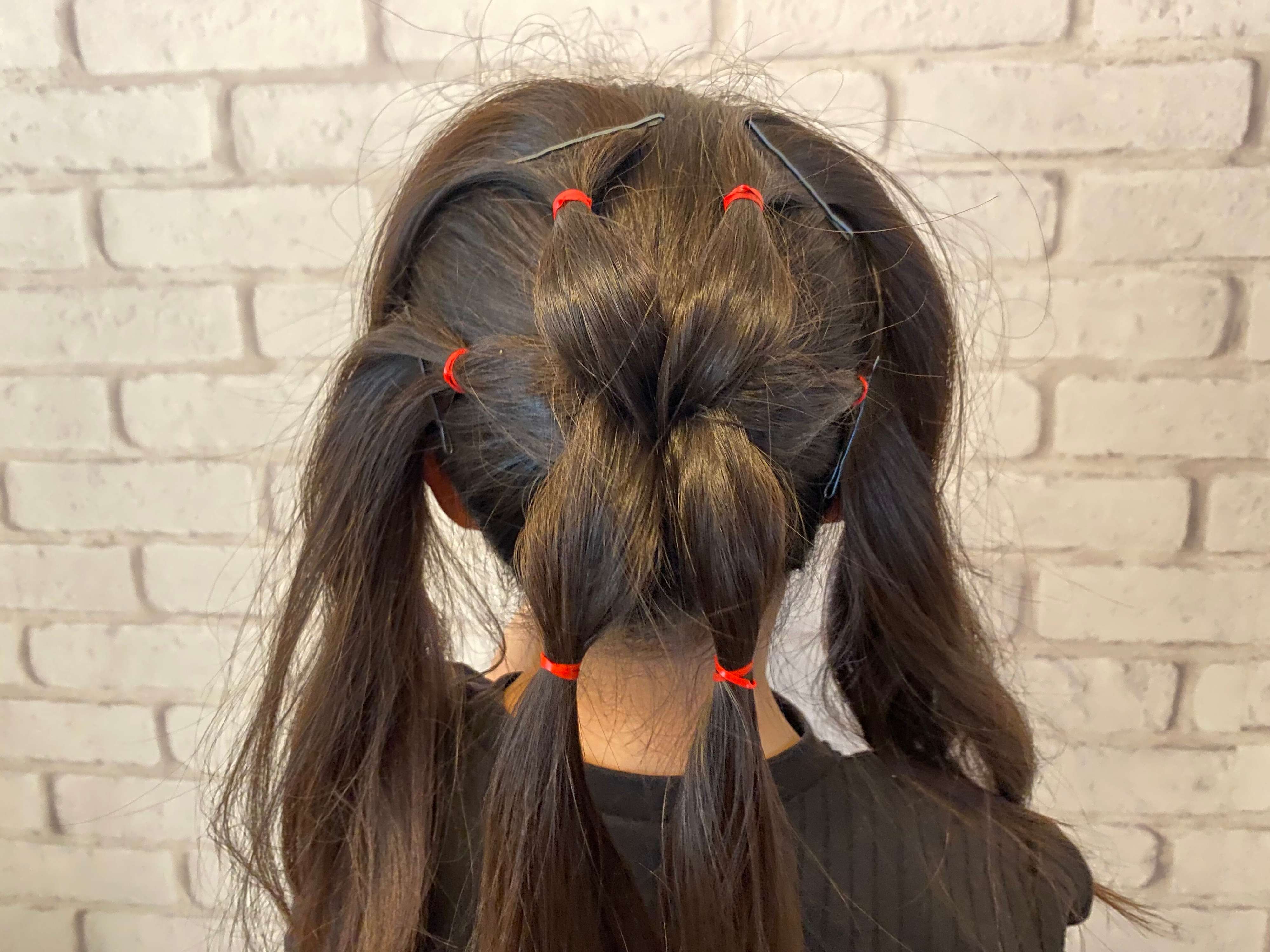 2.ポニーテールにした髪を6つに分け、ポニーテールにしたゴムより数センチあけてゴムで結びます。カラーゴムを使うと可愛いですよ♪