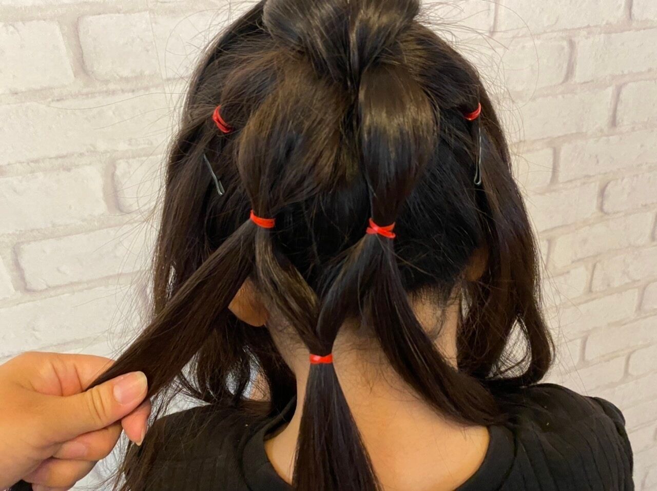 全部で6カ所の隣同士の毛束を半分に分けゴムで留めます。