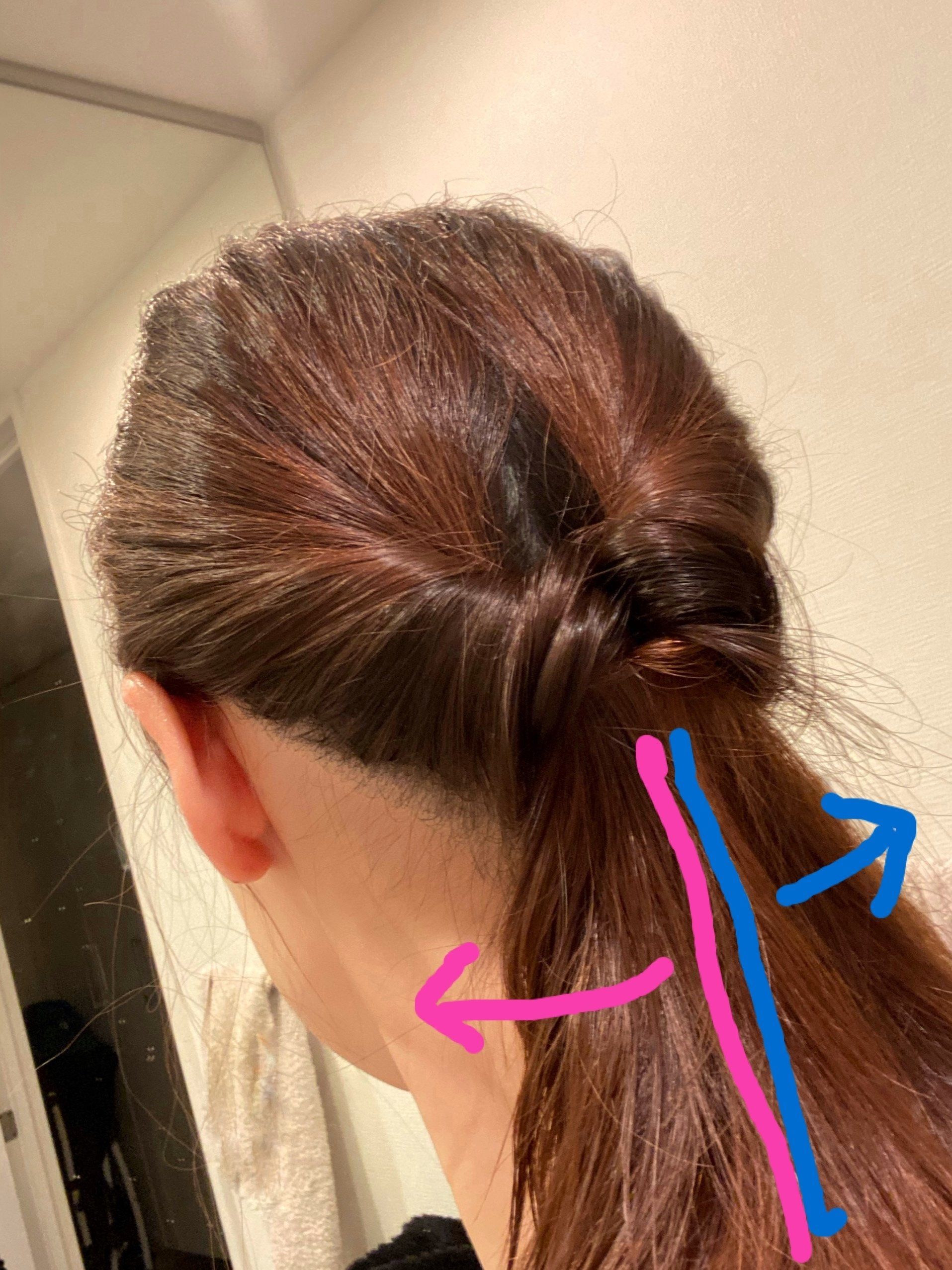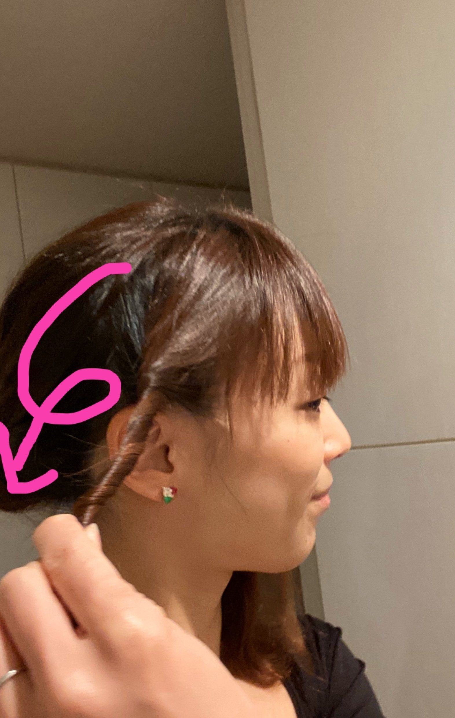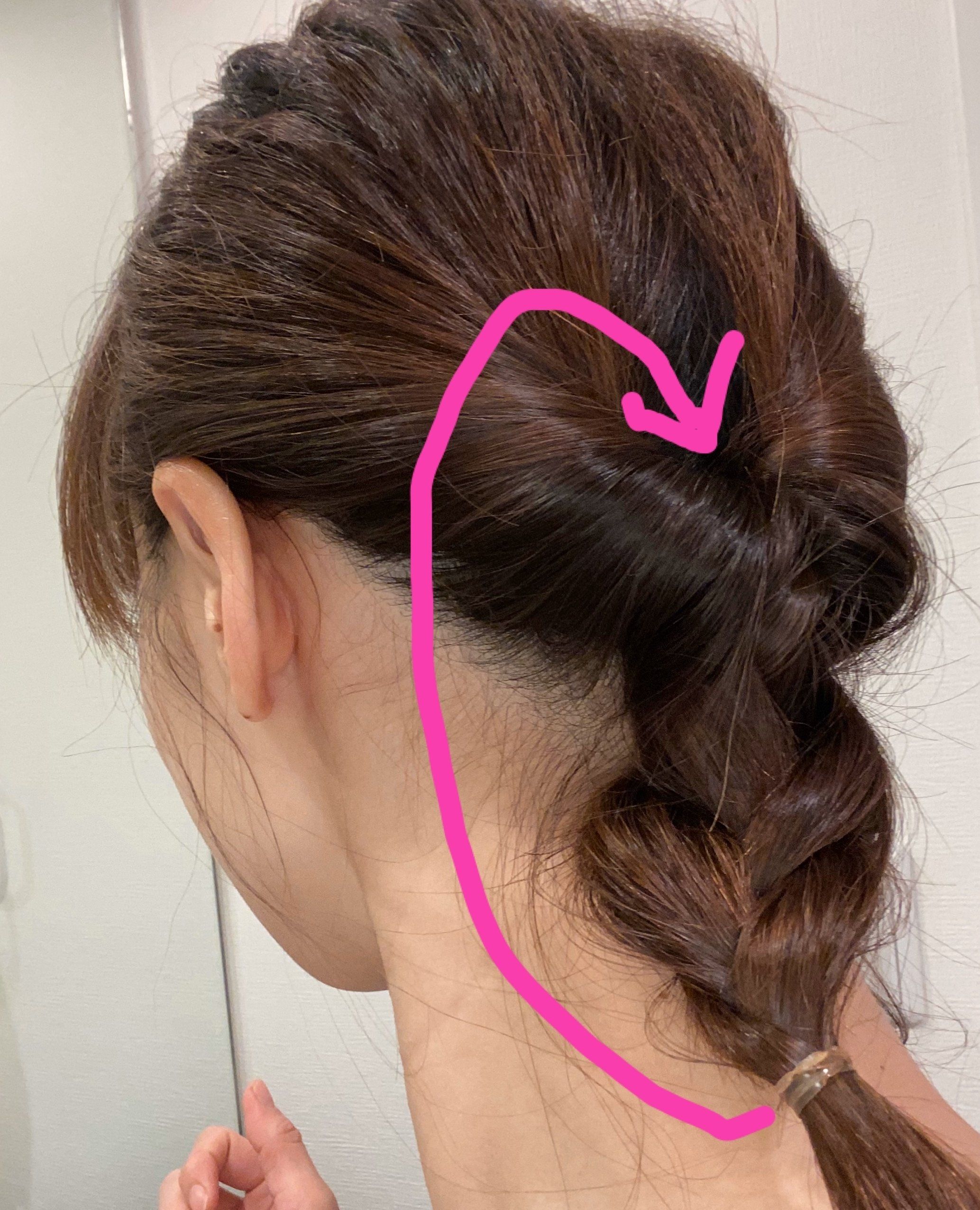 ③ねじった髪の毛先を、くるりんぱした所に入れ込んでピンで止める。