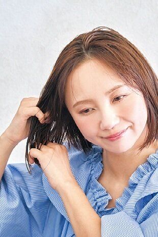 全体を濡らして生えグセをなおし、オイルやクリームなどのアウトバストリートメント剤を手ぐしでつける。