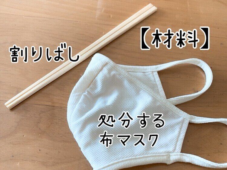 材料は2つ。処分する布マスクと割りばしだけ。割りばしも不思議と家にあるもの。コンビニやスーパーでもらったのが数本は家にあったりしますよね。わざわざ買わないといけない材料はありませんよ。