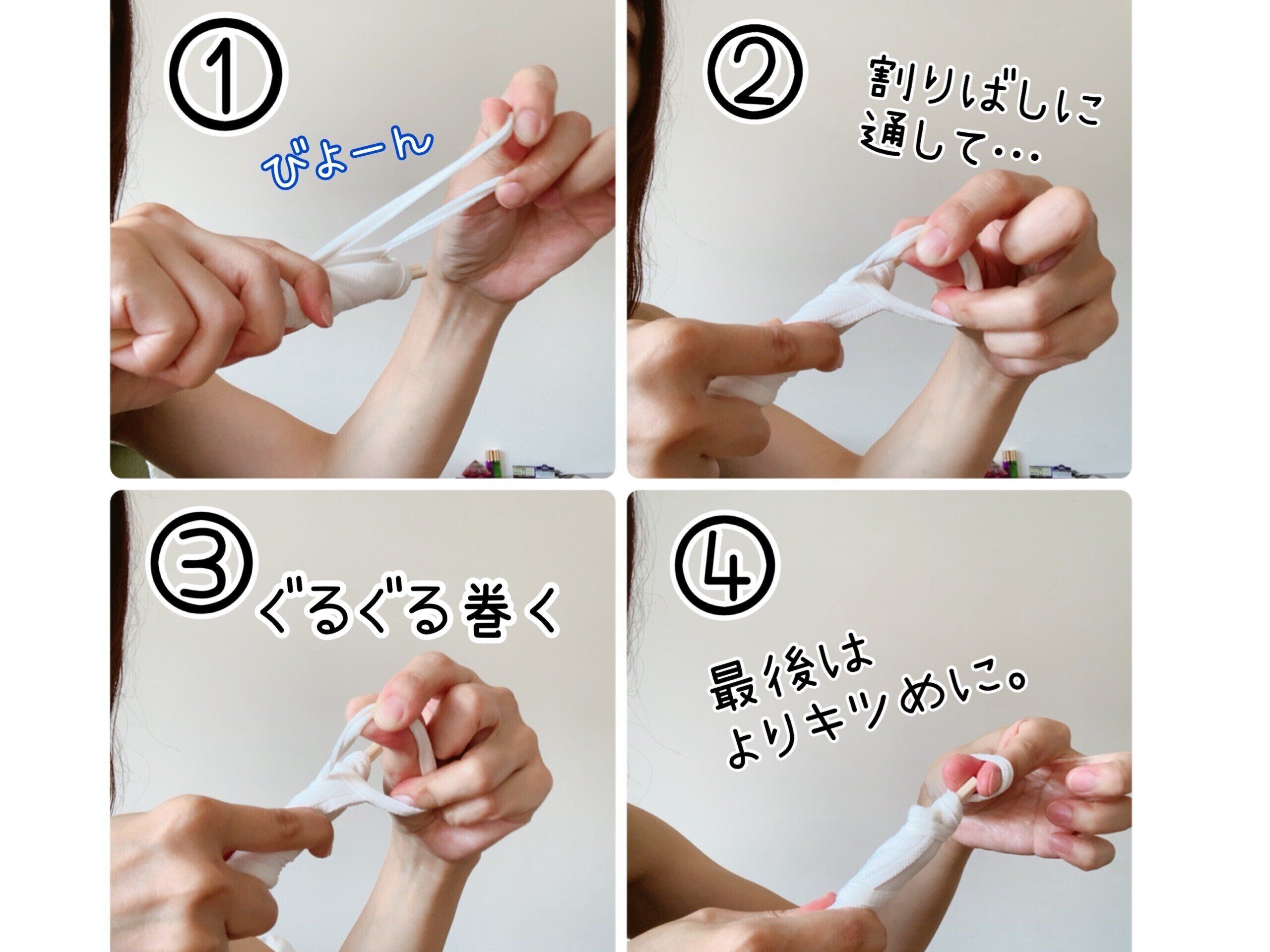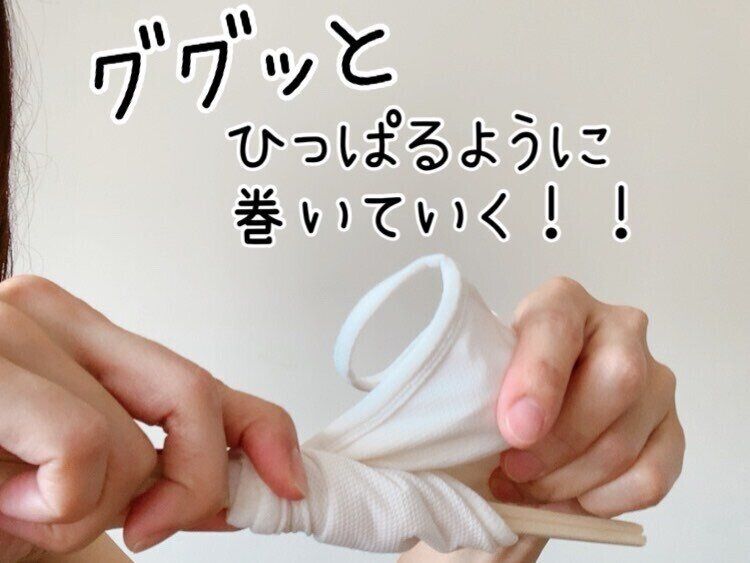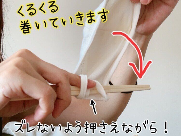 割りばしにひっかけたヒモがずれないように割りばしを持っている手で押さえます。ずれないように押さえながら、反対の手を使って布マスクを割りばしにくるくると巻き付けていきます。