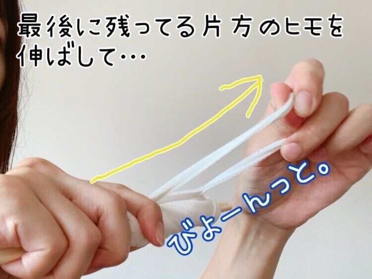 布マスクの生地をくるくると巻き終わったら、最後の仕上げに入ります。残っているもう片方のヒモをしっかりと伸ばします。ここも緩く伸ばすとせっかく巻いた布マスクがたるみますので、気を付けてください。