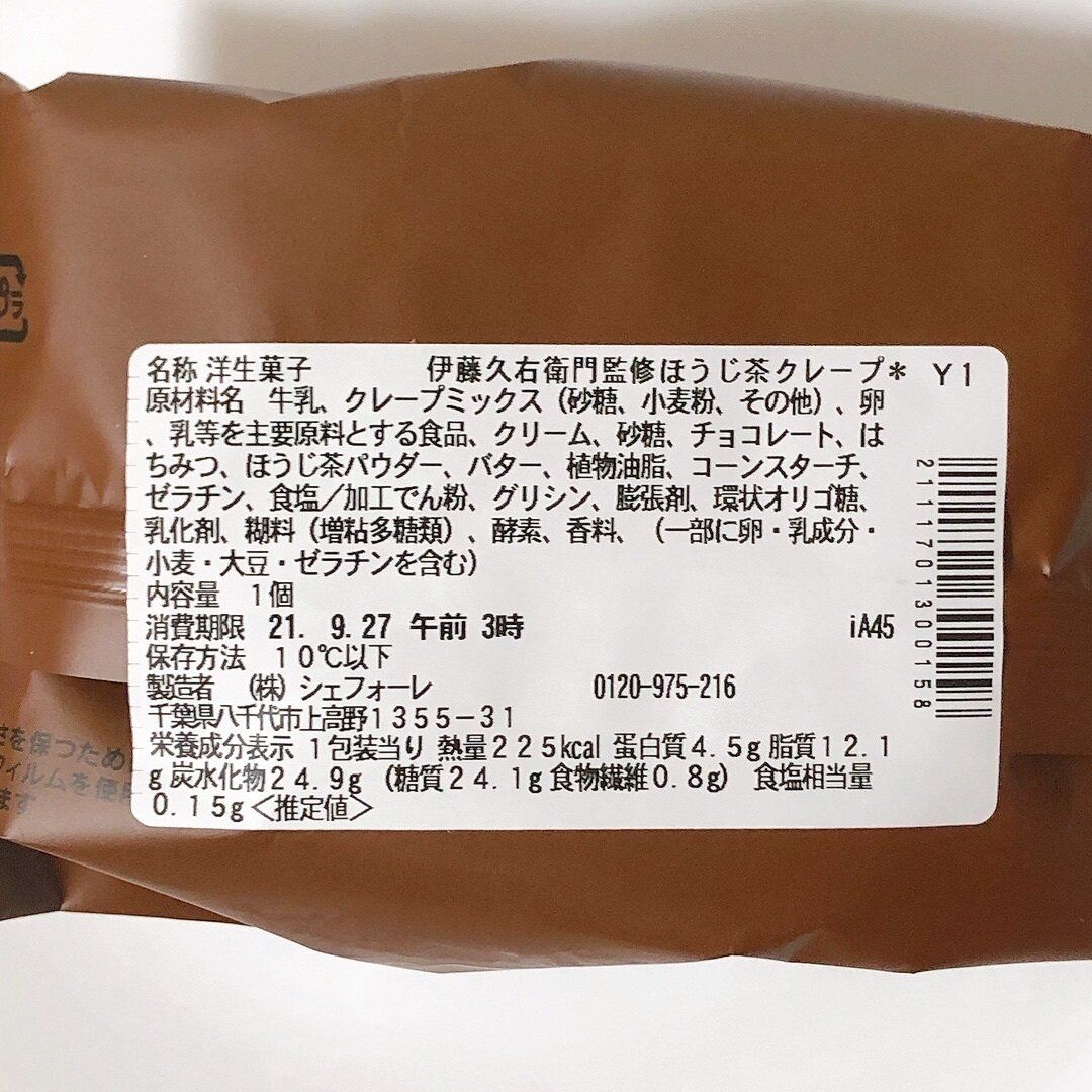 一品目は、ほうじ茶クレープ。セブンイレブンのクレープは、クリームたっぷりで満足感があり、コストパフォーマンスも良いので期待していました。(税込192円、225kcal)