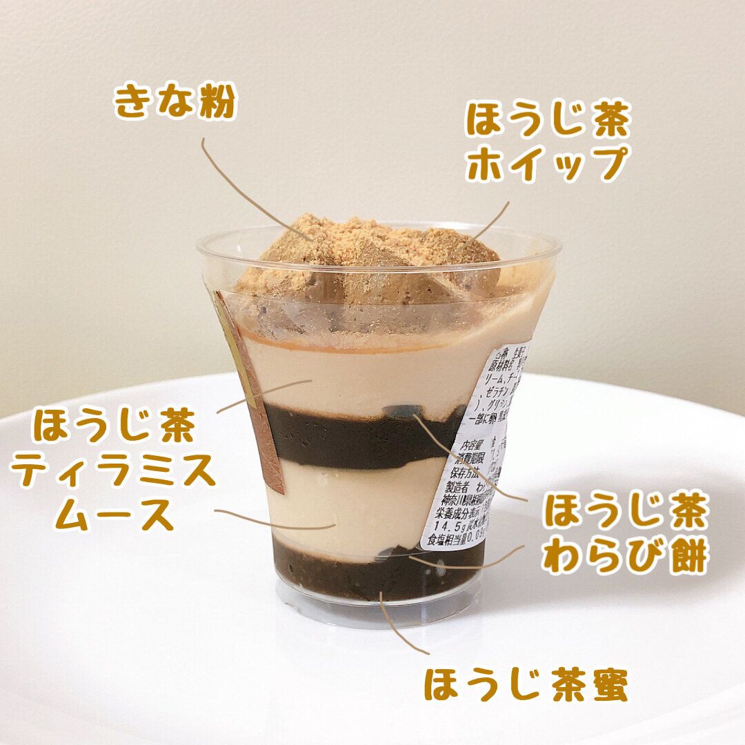二品目は、ほうじ茶ティラミスパフェ。ほうじ茶とチーズを組み合わせた味の想像がつかず、ワクワクしながら購入しました!(税込300円 241kcal)