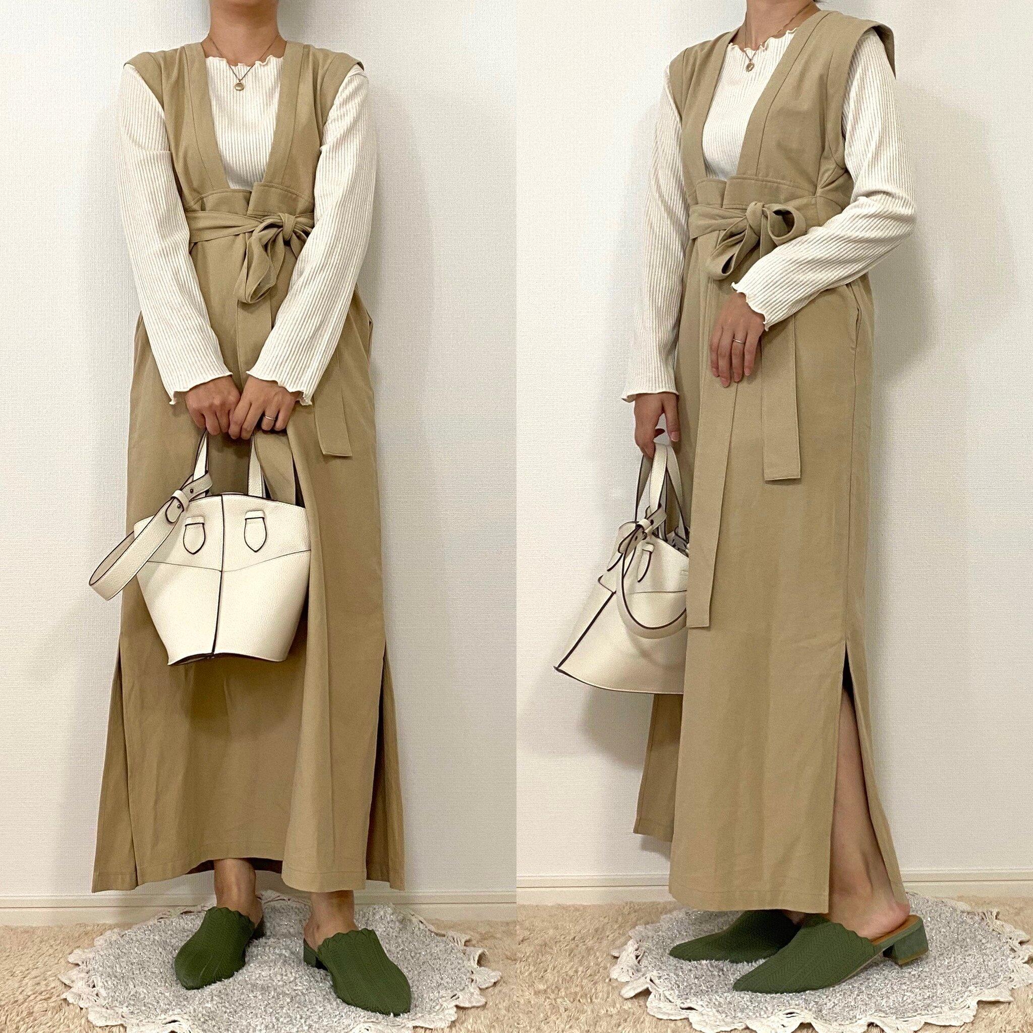 アースカラーコーデってオバサンっぽくなるのが嫌!という方も、差し色に馴染みやすいグリーンを入れることで地味になりすぎずトレンド感もプラスできます。