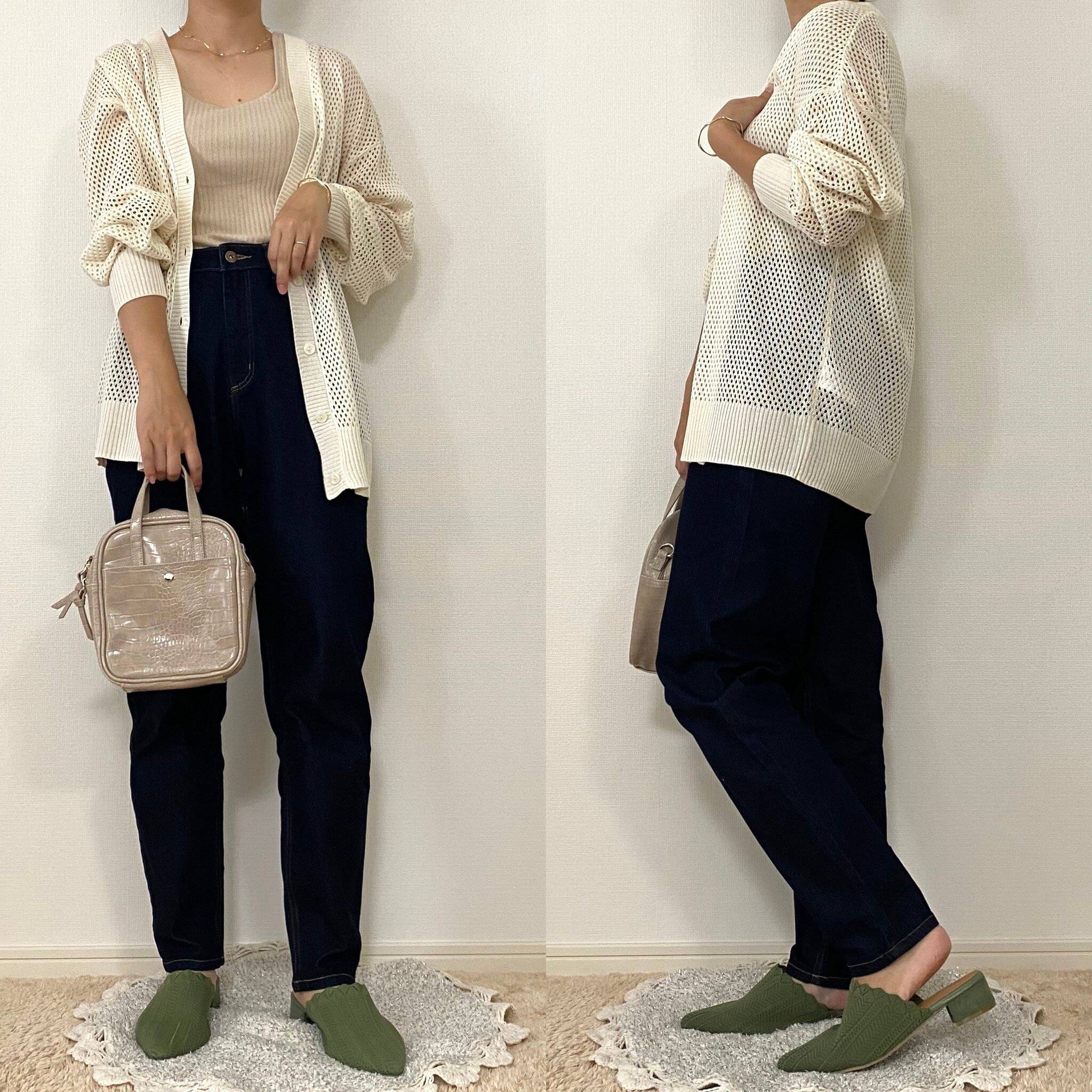 今回はグリーンのミュールを差し色として使ったコーデも一緒にご紹介します。