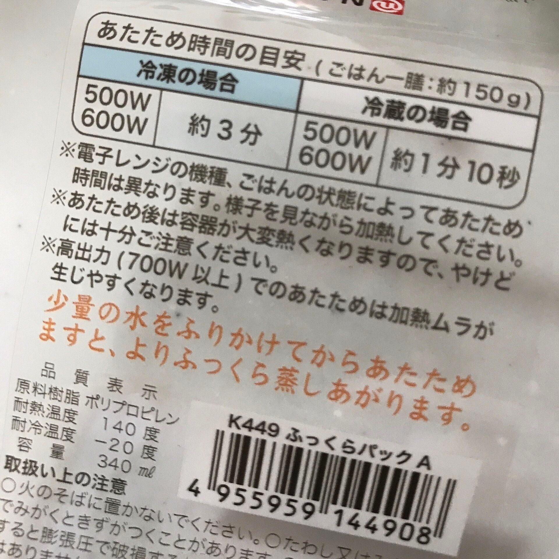 表示どおり、パックを取り出してそのままレンジに入れて600Wで約3分加熱しました。