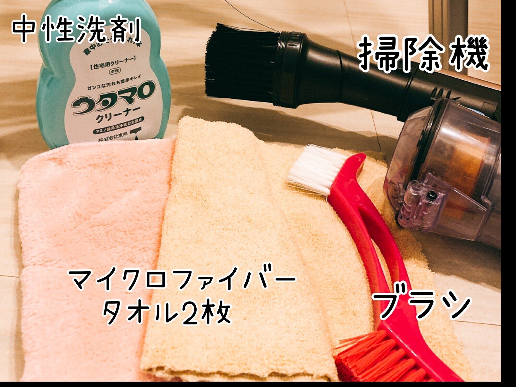 中性洗剤は食器用洗剤を水で薄めたものでもOKです。また、マイクロファイバータオルがなくても普通のタオルでも大丈夫です。ただ、マイクロファイバータオルはタオルの繊維が付きにくいのでおススメしています。