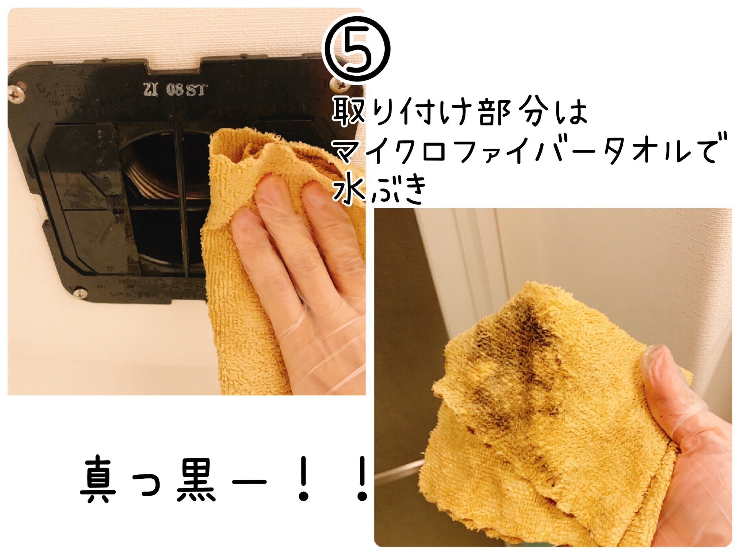 換気扇カバー、フィルター、取り付け部分(プロペラがある方はプロペラも)どこもマイクロファイバータオルで乾拭きをします!濡れたままで設置してしまうと、水分にホコリがつき、すぐに汚れの原因となりますので、しっかり乾いたのを確認して元に戻してください。