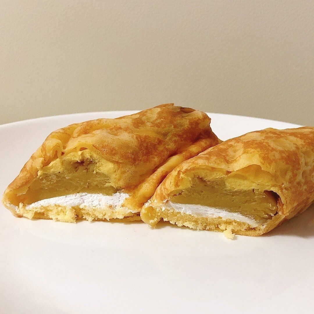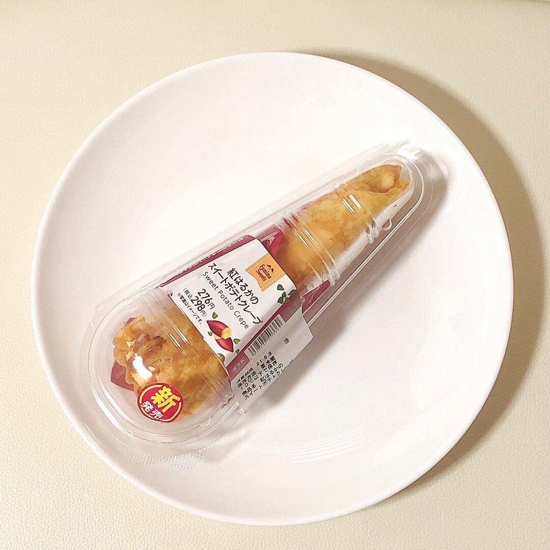 ファミリーマート特有のワンハンドで食べられる専門店風クレープです。大麦を配合したもちもち生地に、さつまいもクリームと練乳入りホイップのダブルクリーム。そこにバーナーであぶった甘さ際立つスイートポテトが入っています。キャラメルのようなソースが食欲をそそります。(税込298円、298kcal)