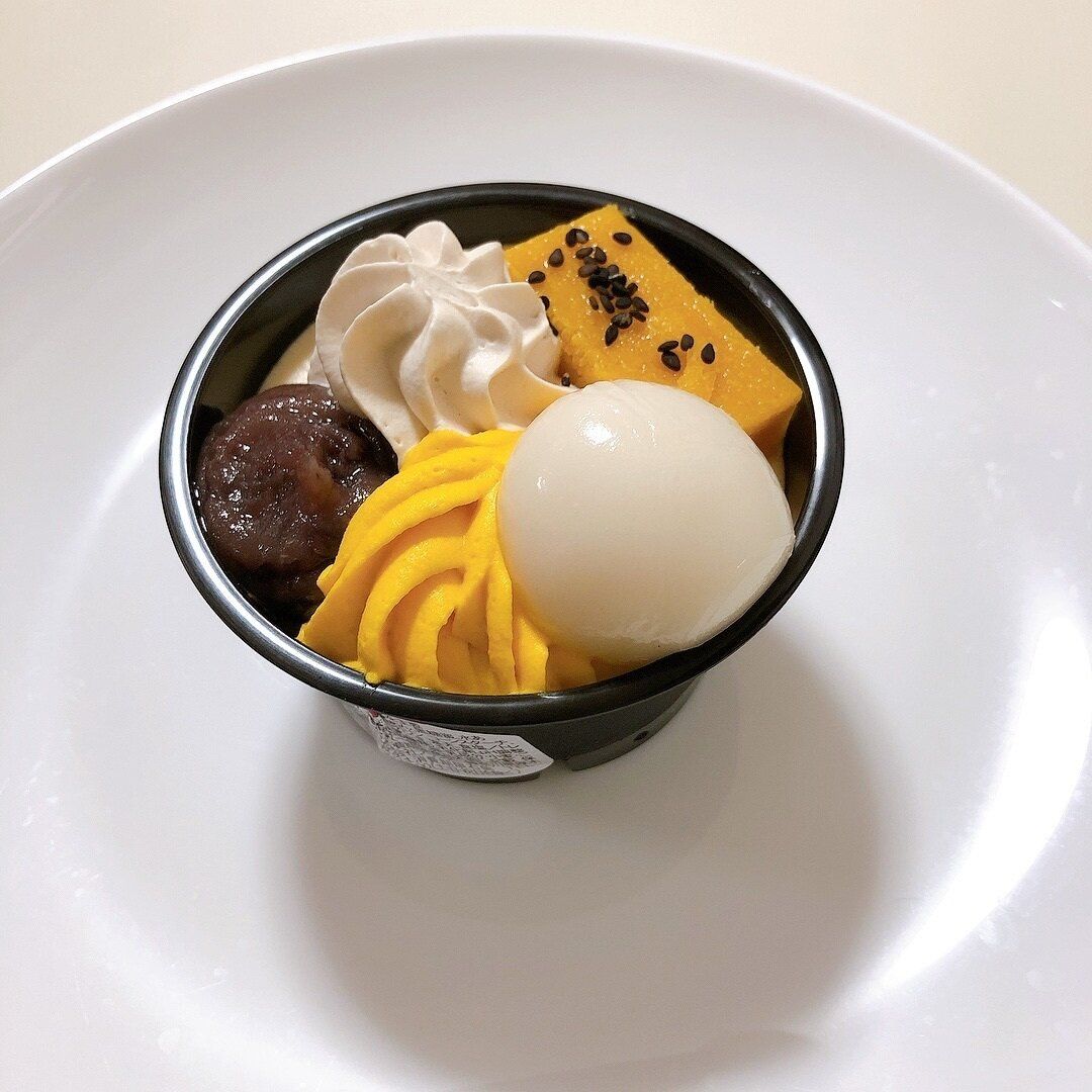 見た目から賑やかな和パフェ。白玉、スイートポテト、2種のクリーム、あんこ…と盛りだくさんのスイーツです。ねっとりお芋代表格の安納芋を使用しています。(税込み298円、302kcal)