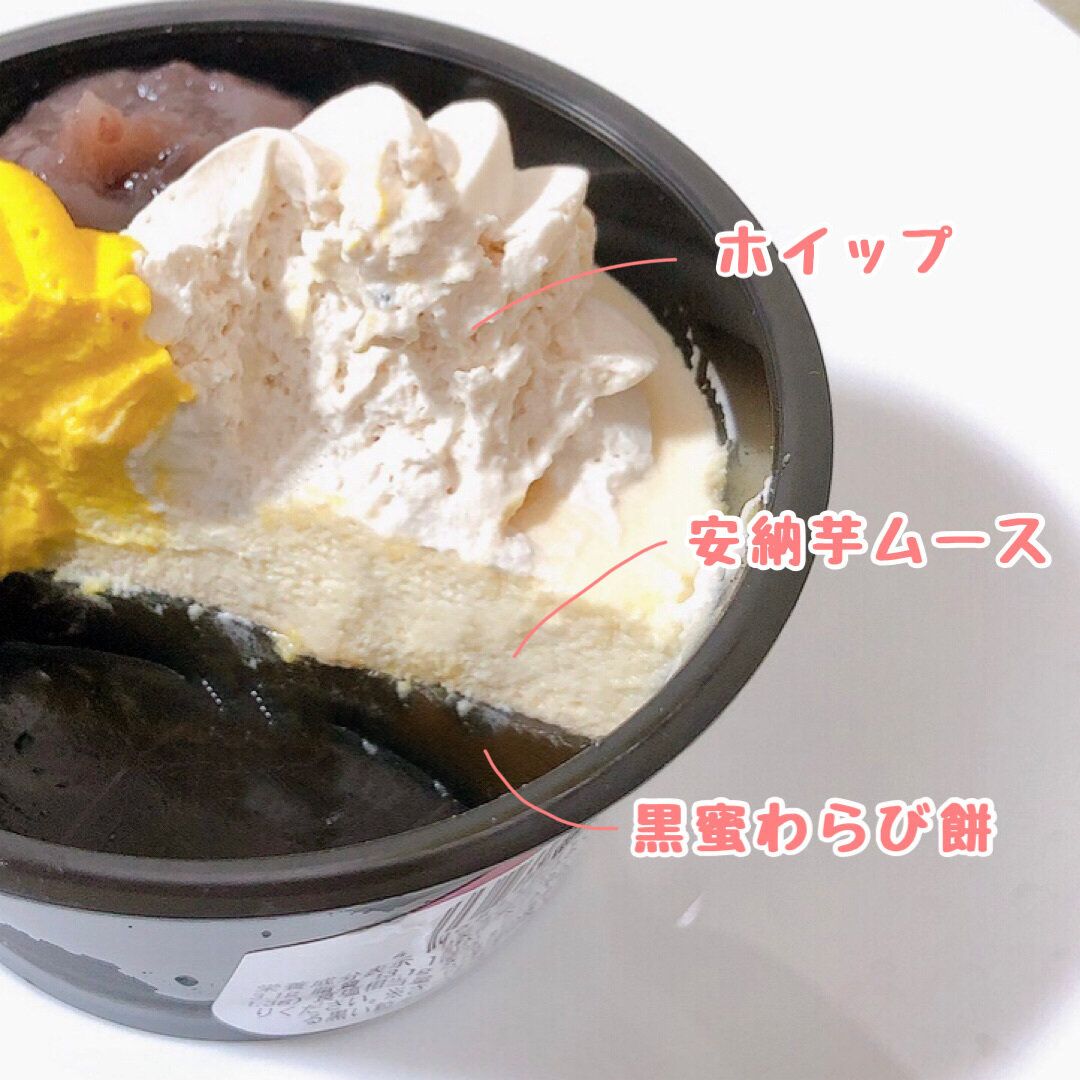 トッピングの下にはさつまいもムースと黒蜜わらび餅。やさしい味なので、トッピングと一緒に食べると味のバランスがとれます。