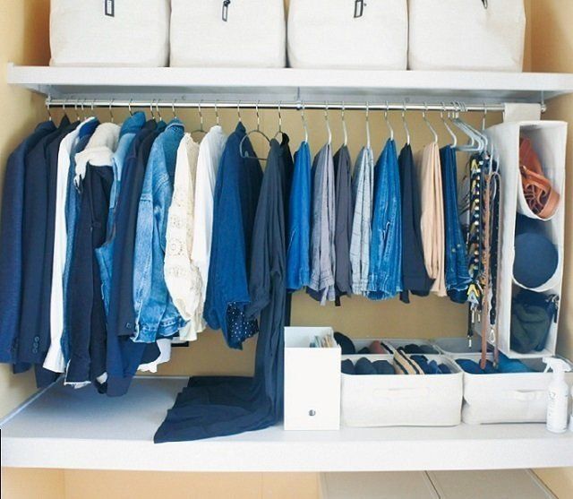 クローゼットの中の洋服も、色別にまとめるとスッキリ見えます。服を減らすことなく、きれいに見せるポイントですね。
