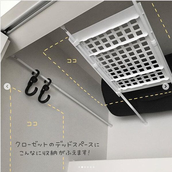 ダイソーで購入できるつっぱり棒&つっぱり棒専用ラックを購入すればクローゼットのデッドスペースに収納を増やすことができます。壁を傷つけず、気軽に取り外しや位置の変更も可能なので簡単に真似できます。