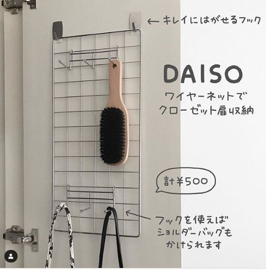 100均のきれいにはがせるフックやワイヤーネットを活用すれば、クローゼットの扉も収納場所として有効活用できます。ショルダーバッグやブラシなど、かけられるものはかけてしまうとよいですね。