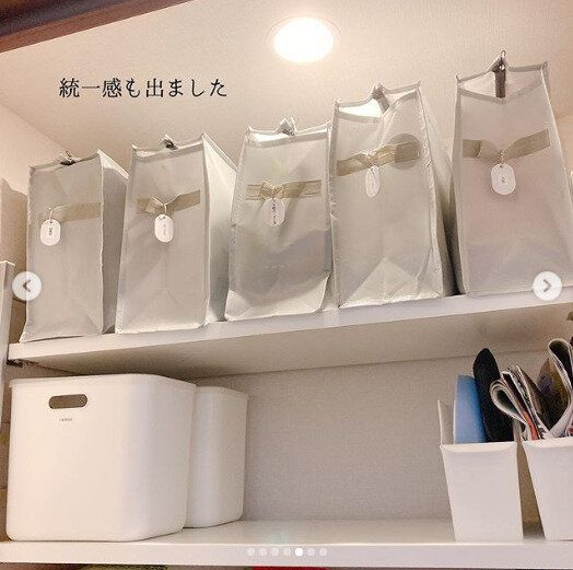 シーズンオフのアイテムは、100均などで購入できる整理バッグに入れネーム札などをつけ、中身がひと目でわかるようにしておくと◎。チャックつきのものを選べば、来シーズンまでほこりなどからもしっかりカバーできます。袋をそろえることで統一感が出て、スッキリ感も高まりますね。