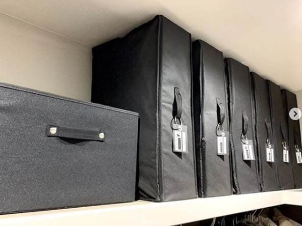 「ポリエステル綿麻混・ソフトボックス」を使って、オフシーズンの洋服を収納したアイデアです。クローゼット上段にもきちんとおさまり、ラベリングをすることで、中に入っている洋服も一目でわかりますね。使わないときにはコンパクトに折りたたむことができるソフトボックスは優秀アイテムです。