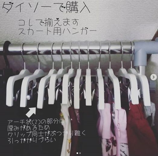 ダイソーなどの100均にはいろいろな種類のハンガーがあります。こちらのクローゼットで使われているハンガーはダイソーのもの。クリップ同士がぶつかりにくいので、スカートもスリムに収納することができます。