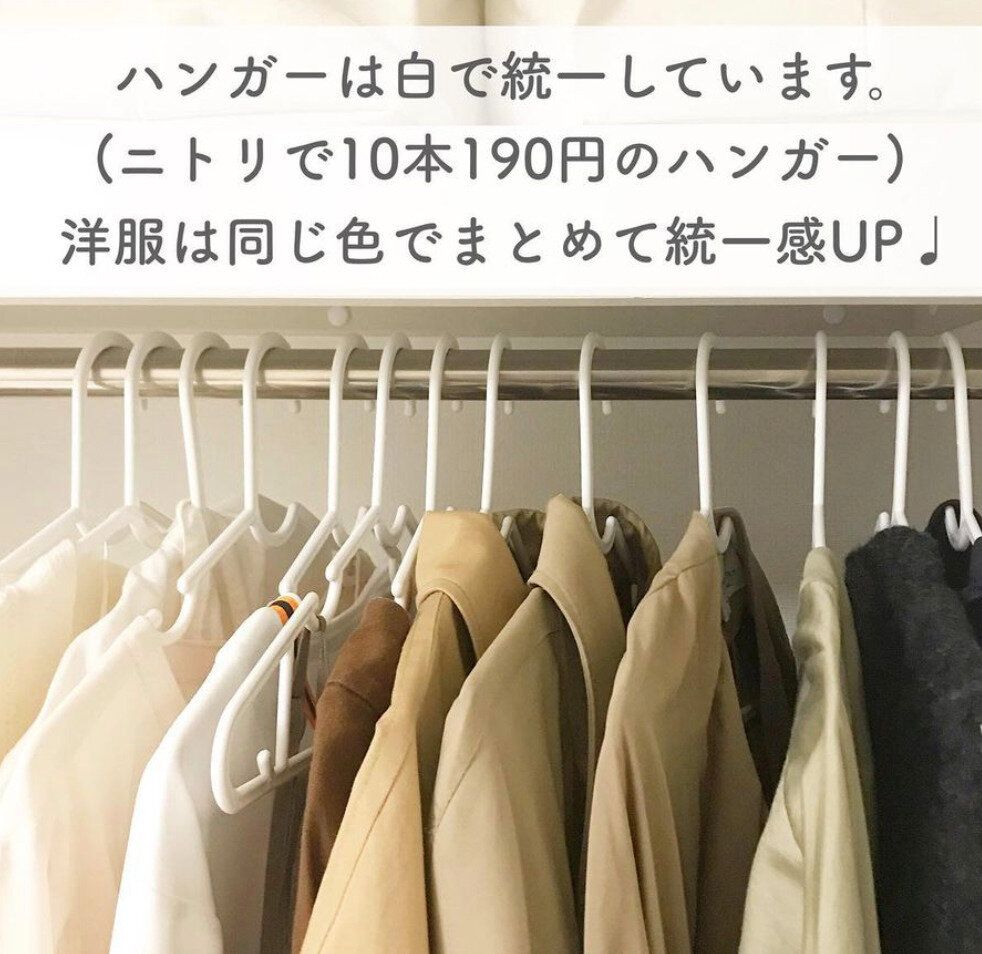 クローゼットをすっきり見せるコツはハンガーを統一すること。ニトリのこちらのハンガーは10本190円でコスパ抜群!服も同系色でまとめるとさらにスッキリとした印象に。