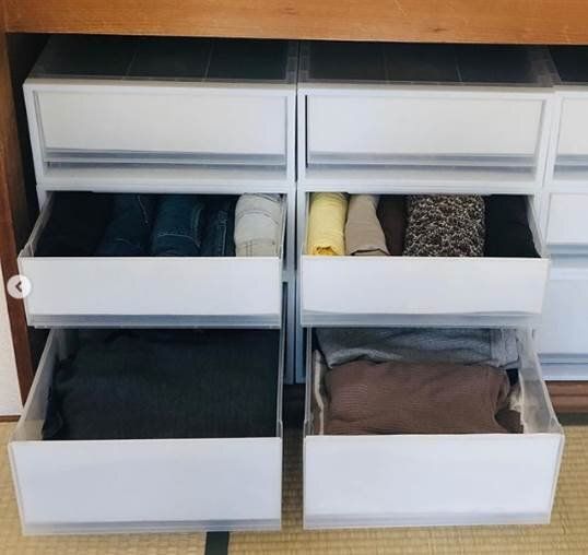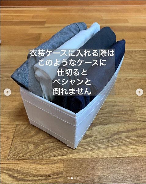 スポーツウエアなどのツルツルした衣類はきれいに畳んで立てて収納してもすぐに倒れてぐちゃぐちゃになりがちです。そんなときはケースを仕切り替わりに小分け収納すればお悩み解決です。