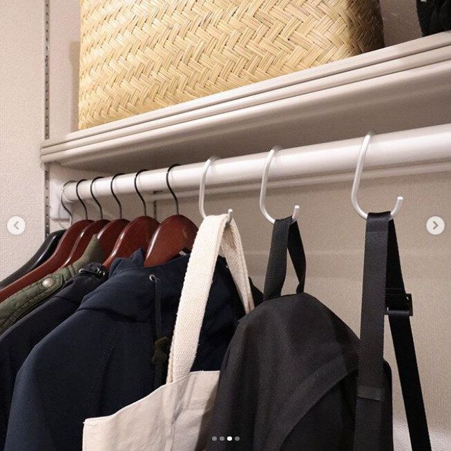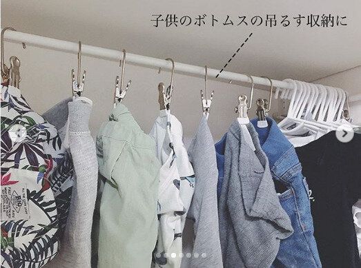 S字フックにチェーン・つっぱり棒と100均でそろうアイテムで収納スペースを2倍にしたアイデア。自由に高さを変えられるので、季節や成長に合わせてスペースの調整が可能です。