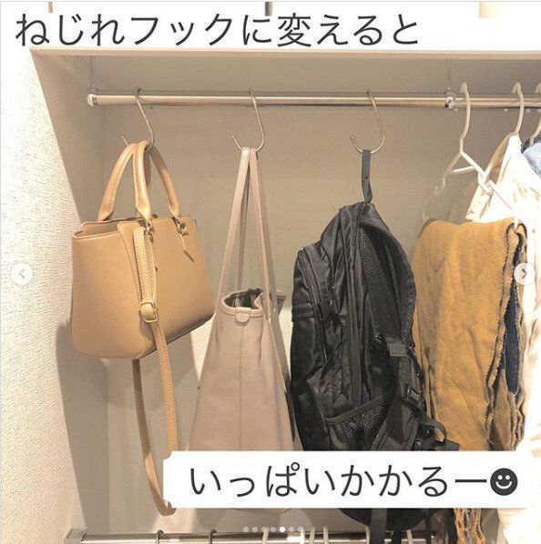 こちらは、S字フックにダイソーで売っているチェーンを引っかけた自作の収納グッズです。チェーンの穴にハンガーをかけられるので、縦の空間を最大限に利用することができます。長さはお好みで調整可能。ご自宅のクローゼットに合わせて、簡単に取り入れられるアイデアです。