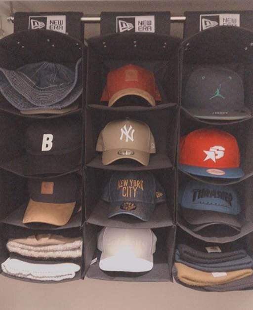 バッグや帽子などの小物は、棚にそのまま置くよりも収納ボックスを利用したほうが見た目もよく、わかりやすくなります。同じ種類の収納ボックスを使えば、統一感も出ますね。