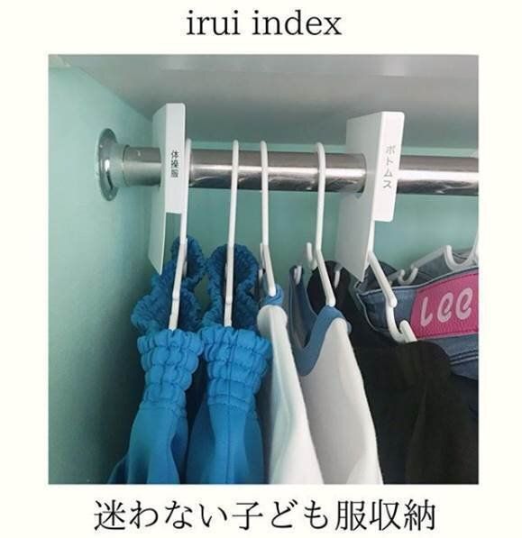 ハンガーポールにマジックテープで、あらかじめアイテムごとにエリア分けをしておけば服を選ぶ際にも簡単に取り出すことができるのでおすすめです。またあらかじめエリア分けをしておくことで、どんなアイテムが今どれだけあるのかひと目でわかり、服が増えすぎるのを防ぐことに繋がります。