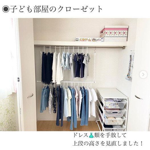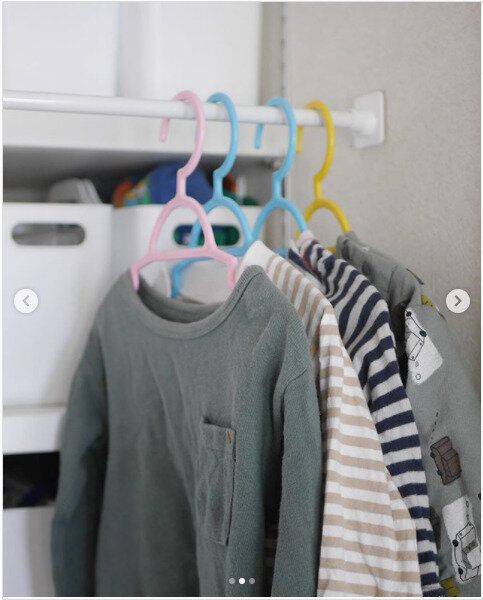こちらもつっぱり棒とフックで収納を2段にしたアイデアです。小さな子ども服は、収納に高さが必要ないためクローゼットの下の空間がムダになりがちですが、デッドスペースを上手に活用しています。