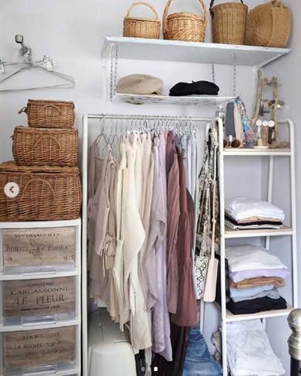 こちらはニトリのカラーボックスに専用のレールと収納バスケットを組み合わせ、衣装ケースにしたアイデア。ほどよく隙間があるため通気性がよく、湿気が多いクローゼット内にもぴったりのアイテムです。