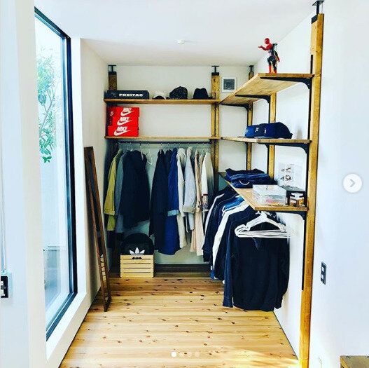 壁に穴を開けることなく棚などがつくれるラブリコを使い、収納をDIY。あらかじめ収納したいものを把握し、想定することでムダなく空間を活用されています。1つの収納方法にこだわらず、見せる収納・かける収納・たたむ収納などを組み合わせてみると、見た目も使い勝手も高まりますね。