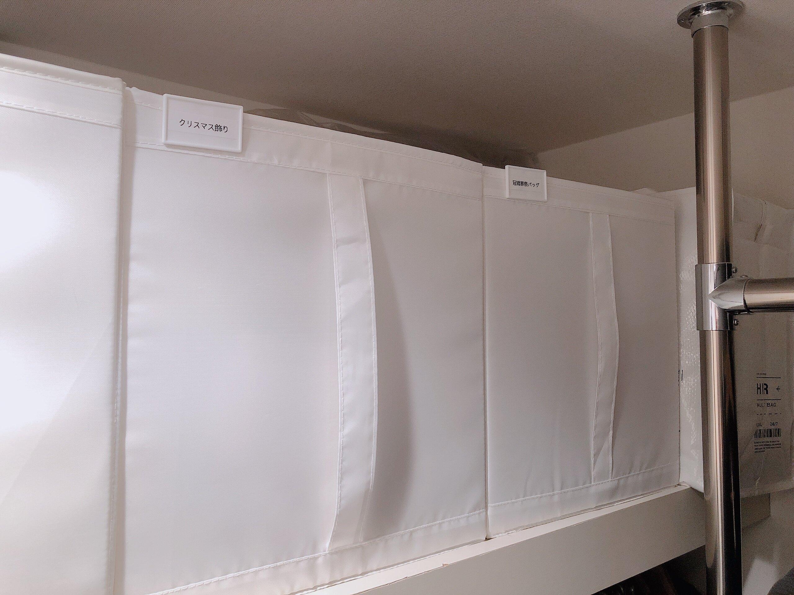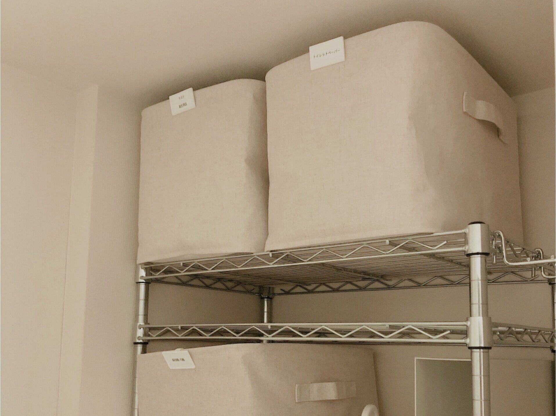 わが家は無印良品の「ポリエステル綿麻混ソフトボックス」やIKEAの「SKUBB」に引っかけています。同じボックスを並べているので、ラベリングするとわかりやすくなります。
