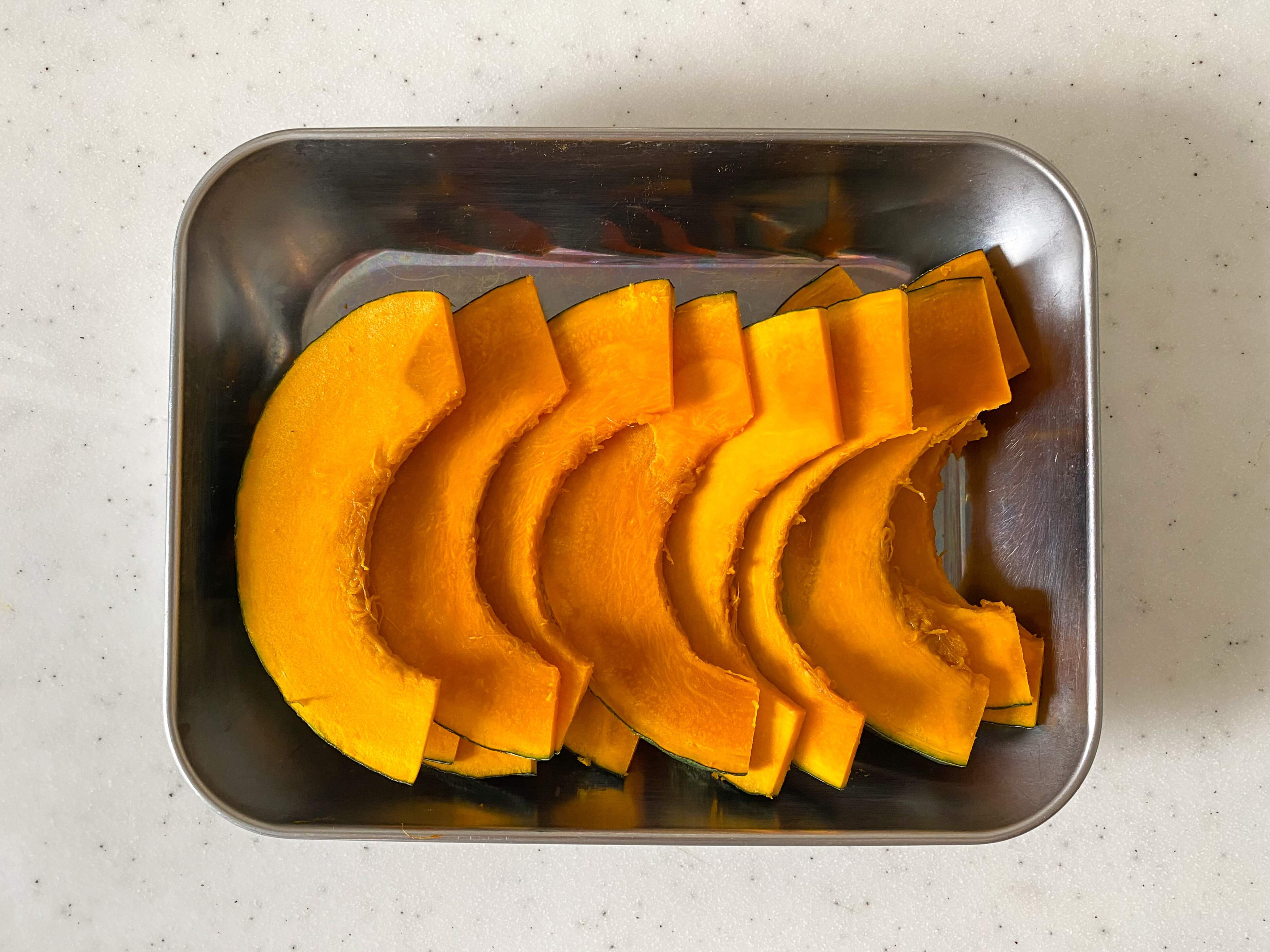 (1) かぼちゃは600Wの電子レンジで3分(1分x3面向きを変える)加熱し、7~8mm厚のくし切りにする。