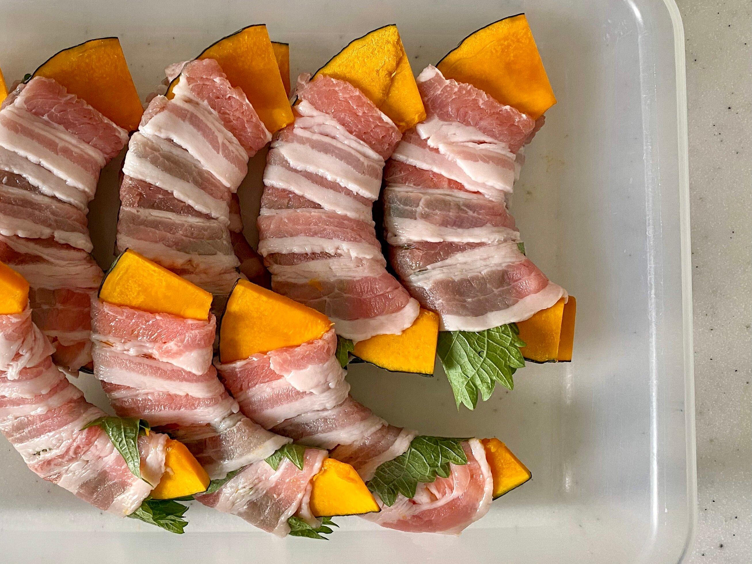 今回は主役の野菜にかぼちゃを使います。豚バラ肉で巻く時に大葉を挟み込むことで、かぼちゃの甘ったるさを軽減。