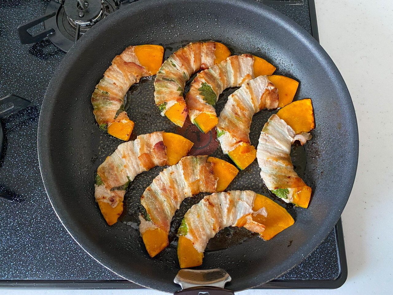もしもう少したくさん焼きたい場合は、かぼちゃの幅を半分にするとフライパンにたくさん並べられますよ。