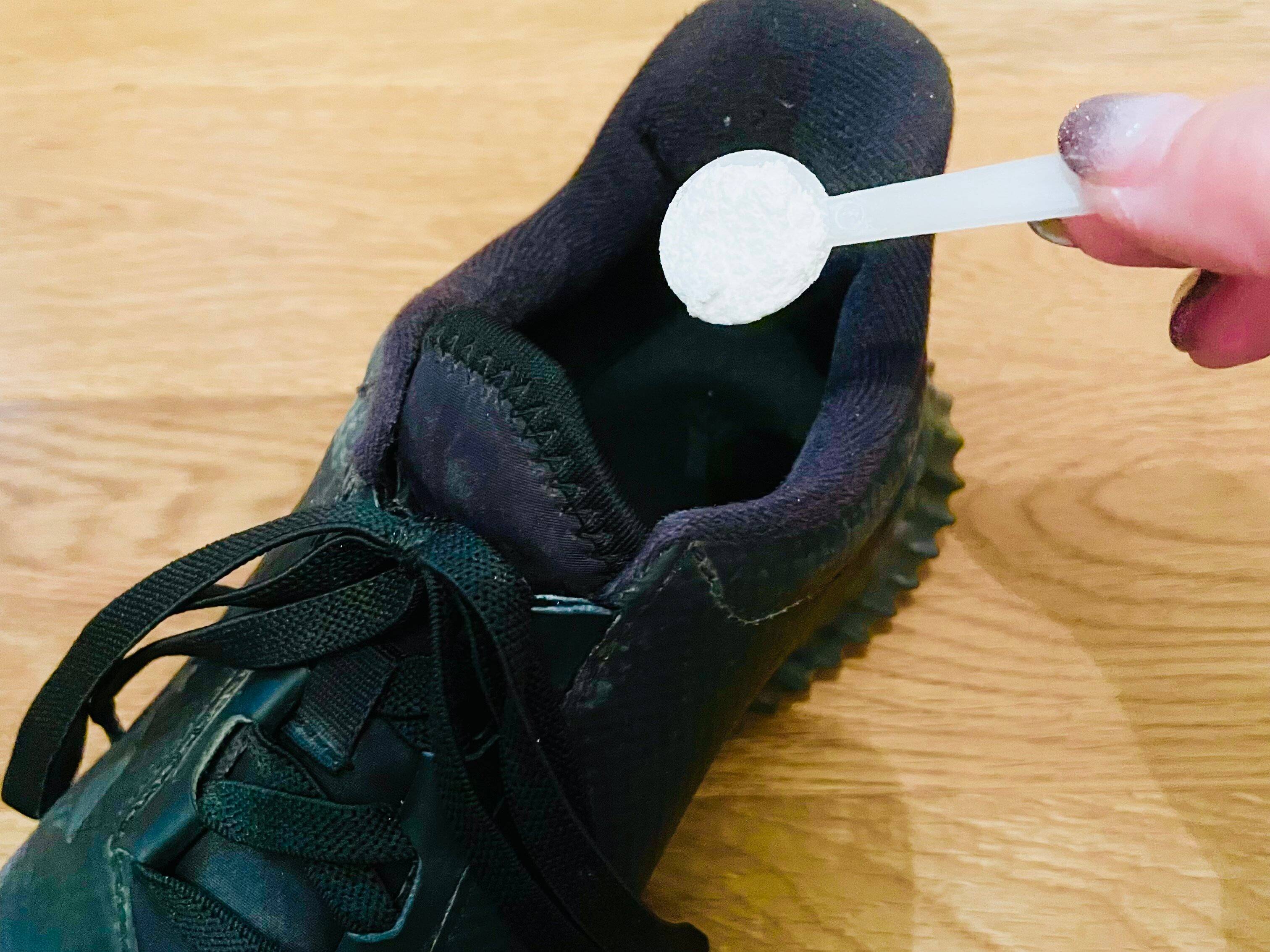 使い方はとても簡単!付属のスプーンで粉を振り入れたら、靴をトントンして、全体に行き渡らせるだけです。