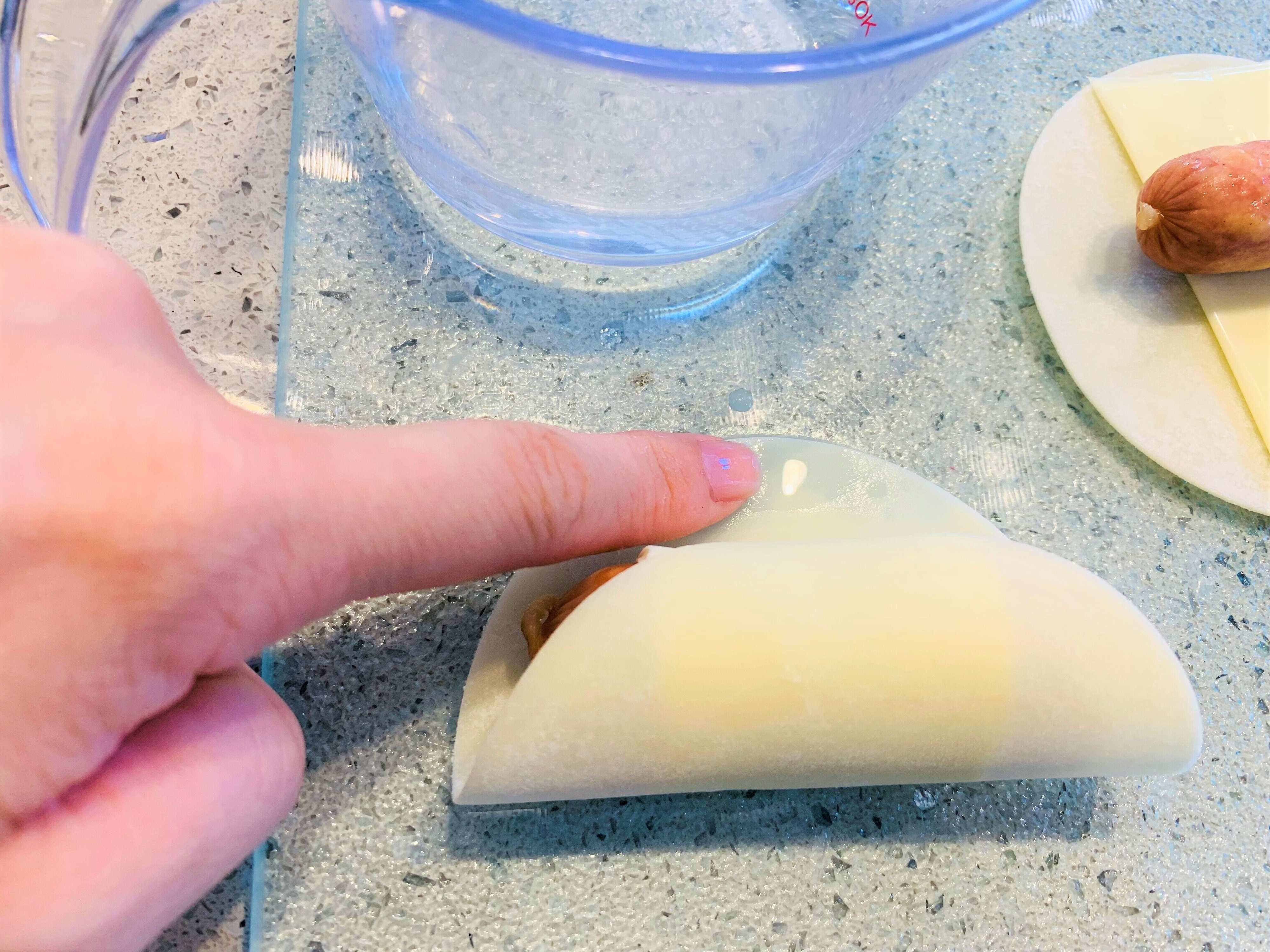 スライスチーズがはみ出そうな時は、先にソーセージにチーズを巻いておくと上手くいきます。