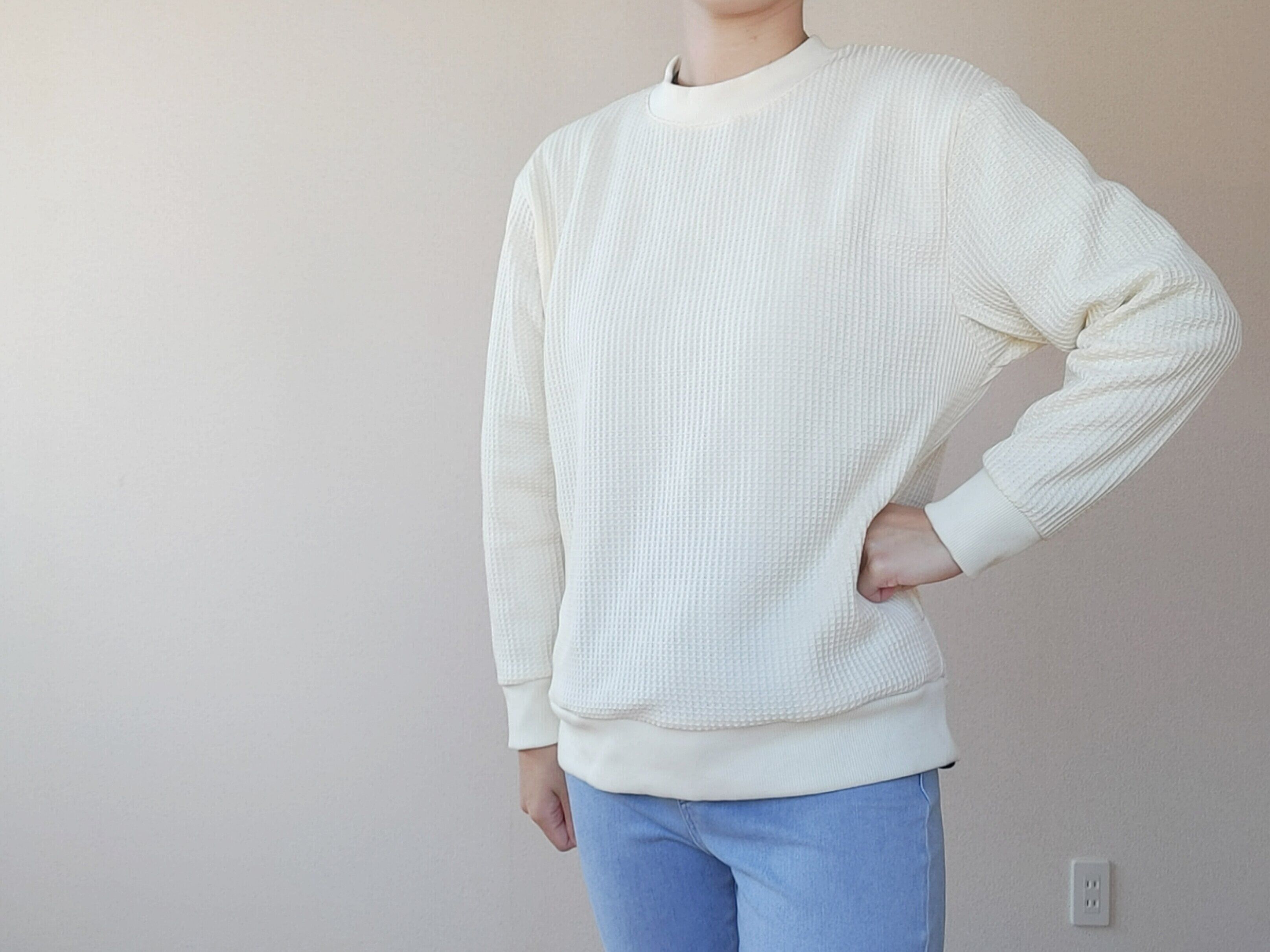 さらっとしたワッフル生地で、軽くて暖かいのが特徴。裏は少しフワッとした手触りになっていて、モコモコした裏起毛ではなく、さらふわとした着心地です。