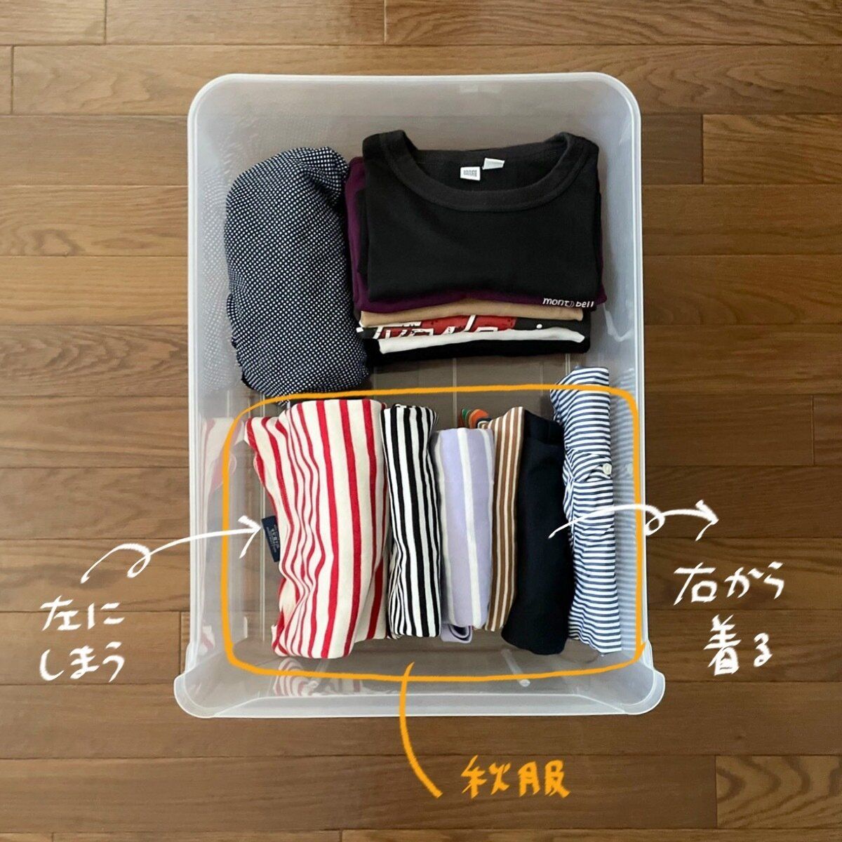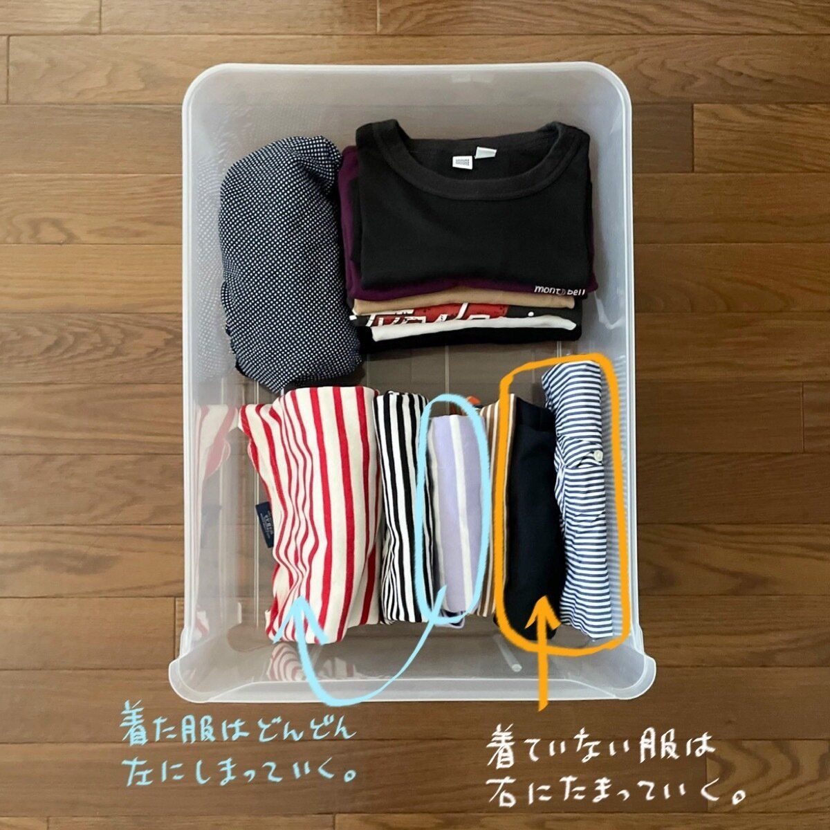 シンプルなルールなので片づけ方が統一しやすいです。さらに、例えば洗濯したばかりのモノをまた使ってしまい古いモノが使われない…なんてこともなくなるので満遍なくモノを使うことができます。