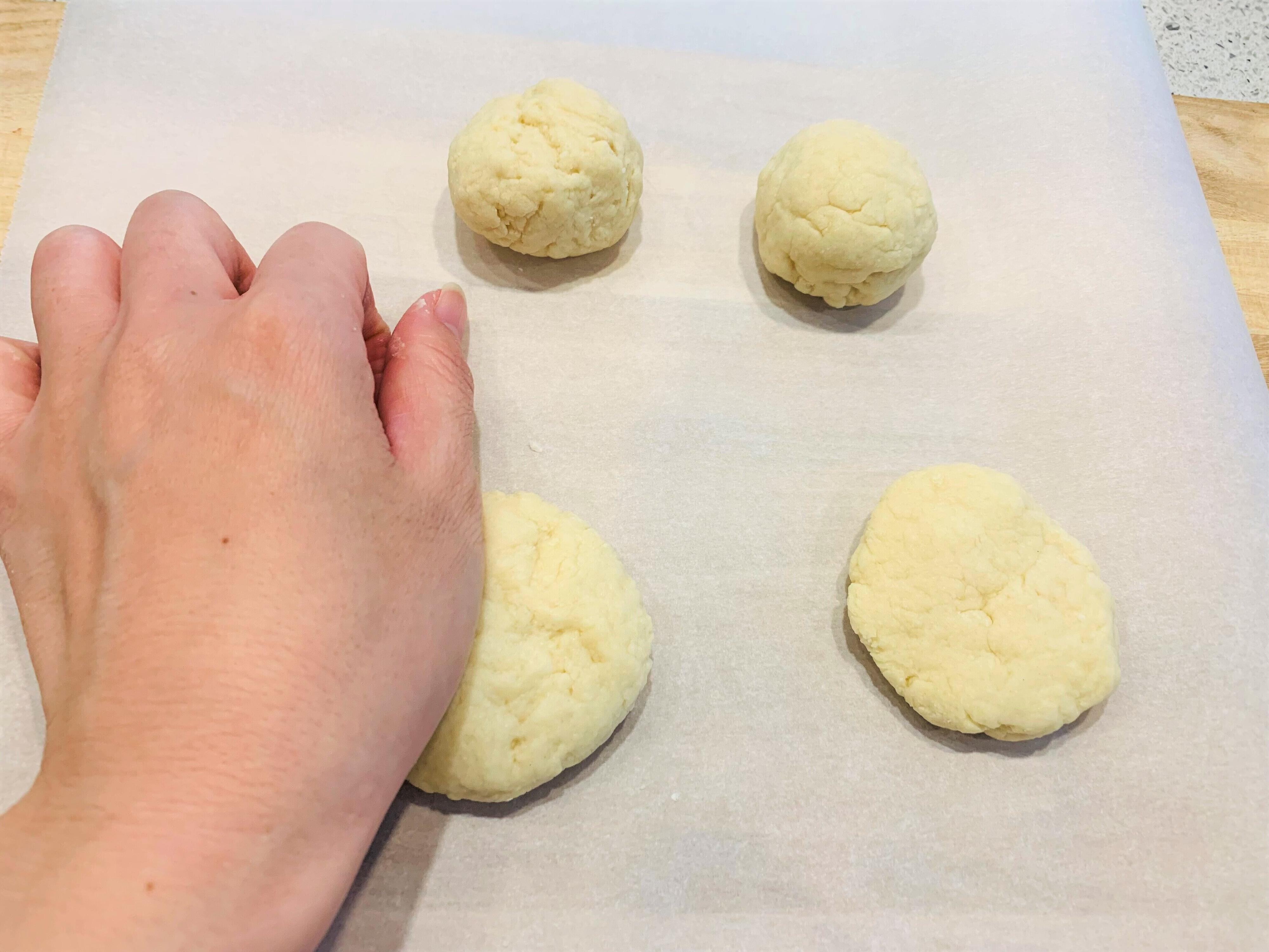 生地がまとまったら4つに分けます。それぞれボールのように丸く成形したあと、ぐっと手で押しながら平らにします。