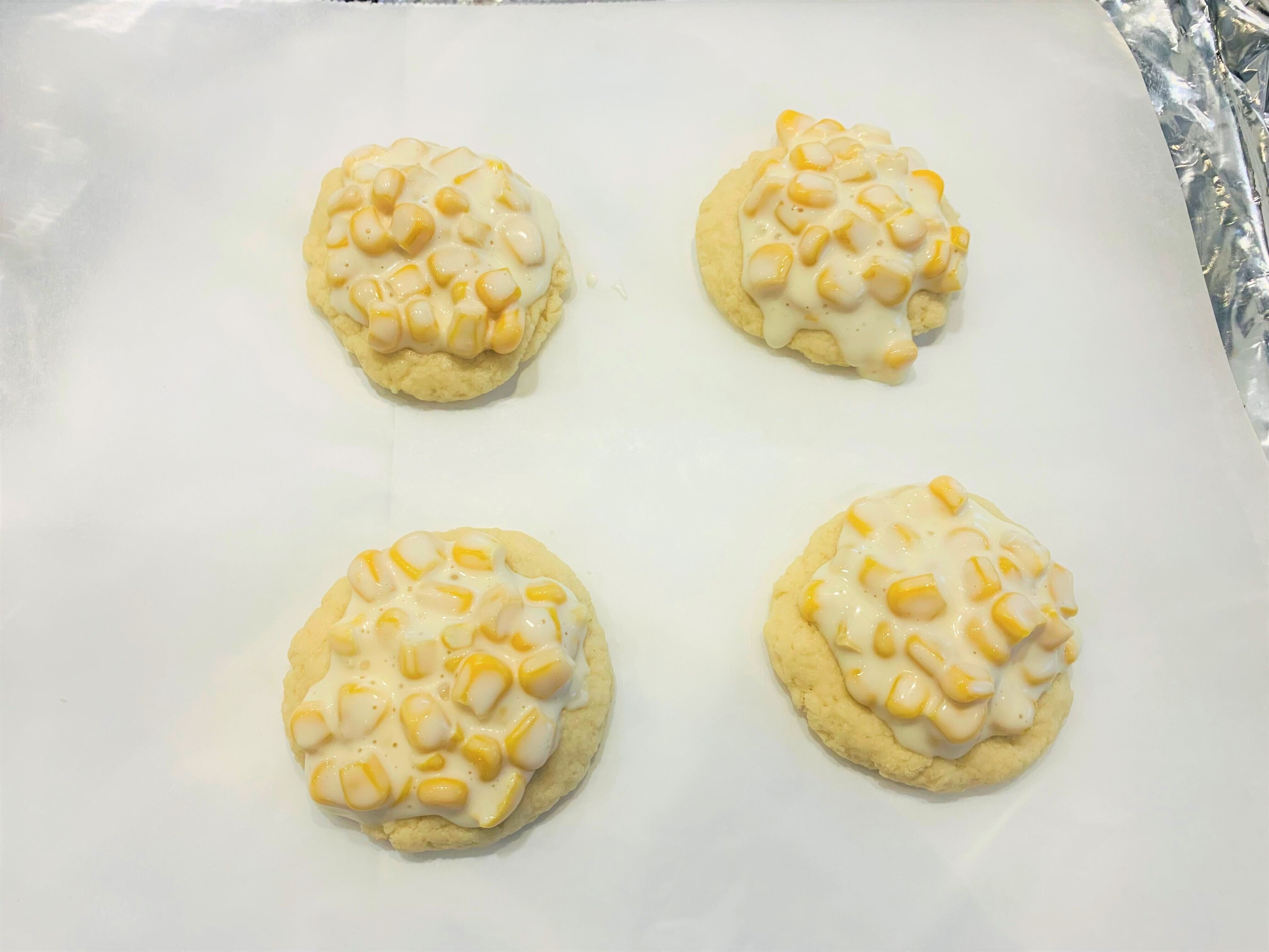 ※生地にマヨコーンをのせるときは、シートを敷いた天板で作業するとよいですよ。具をのせてから生地を動かそうとするとコーンが落ちそうになるので、そのまま焼けるよう天板で仕上げると楽ちんです。