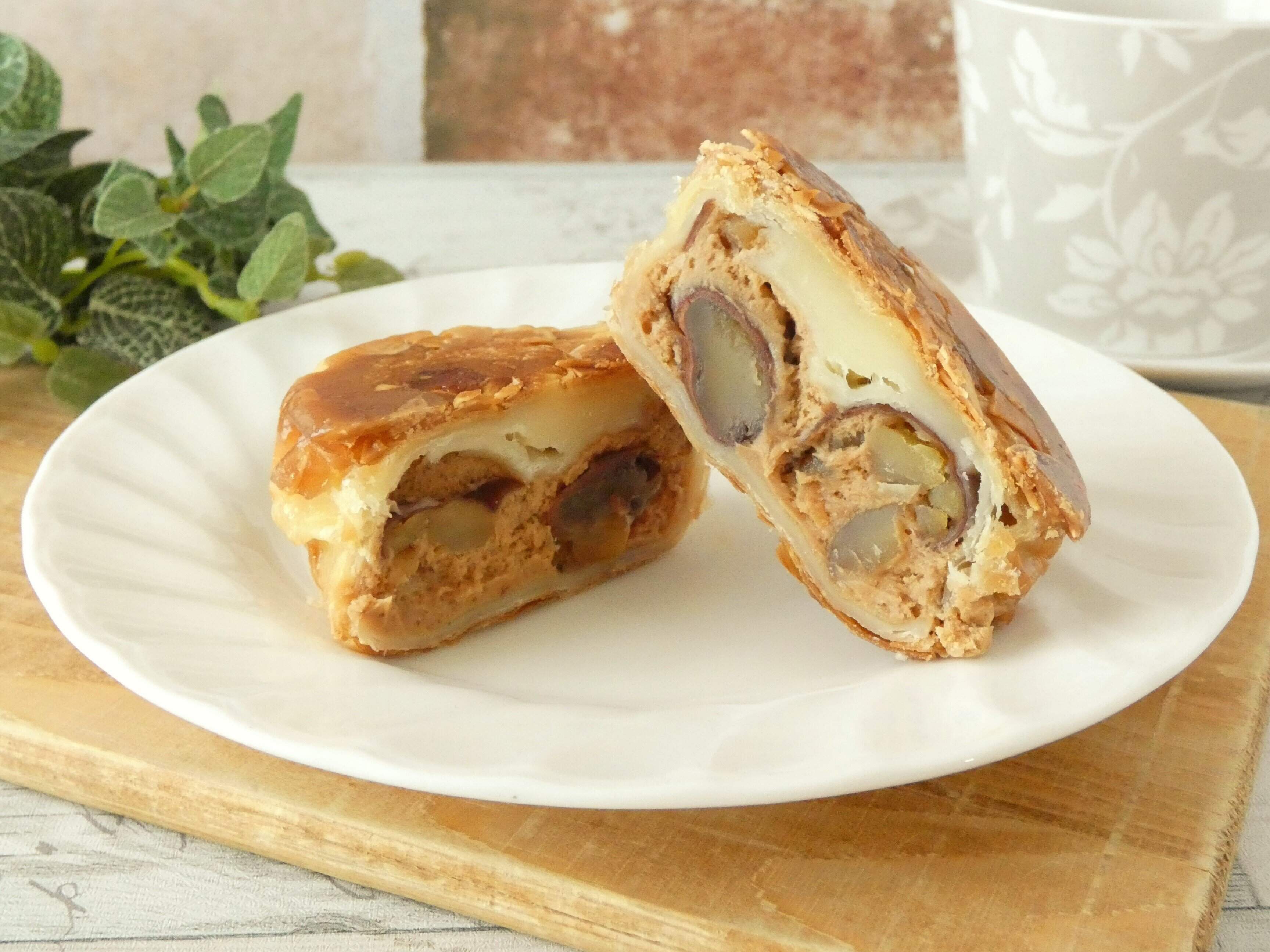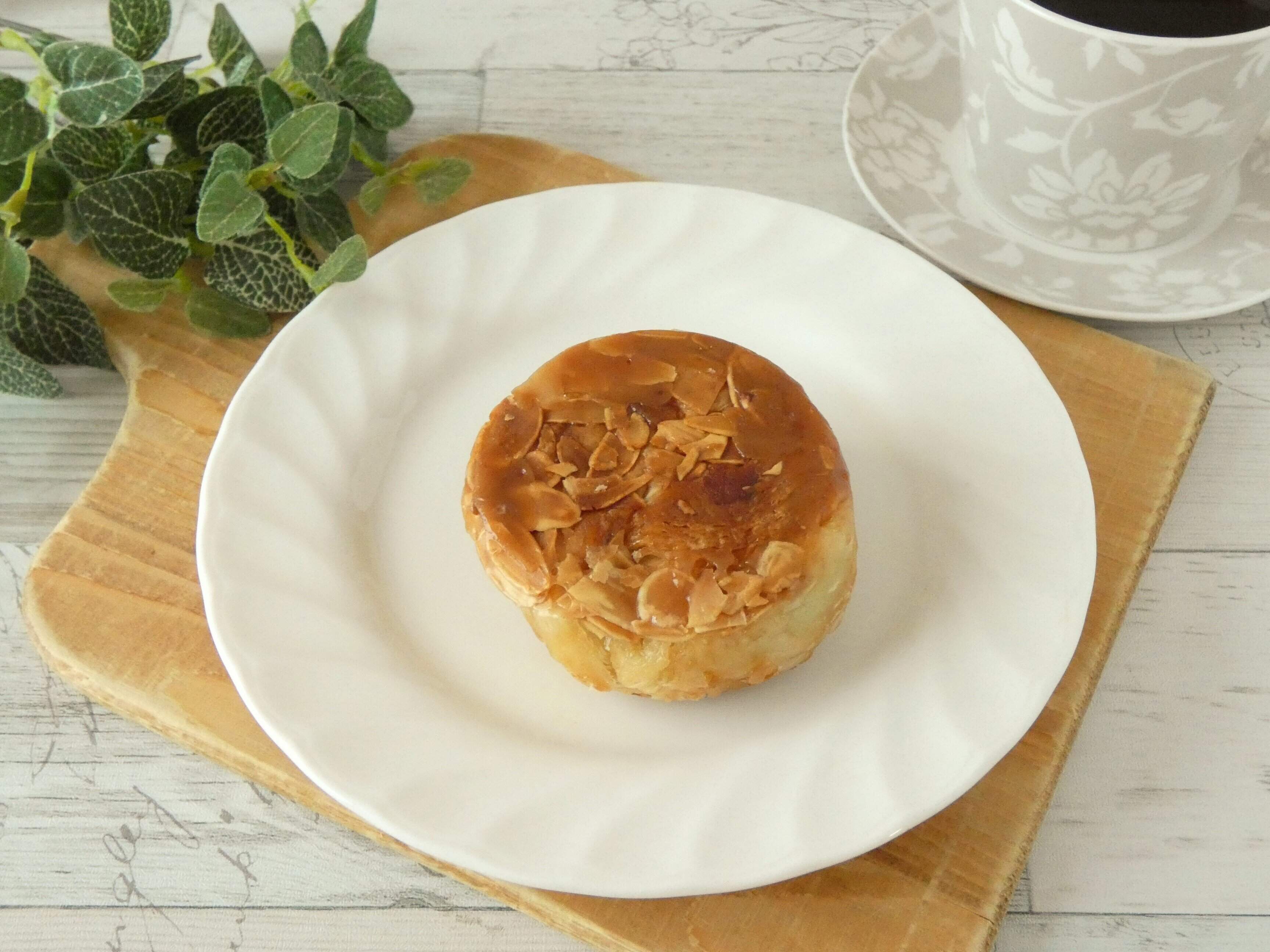 デニッシュ生地の表面はパリッとしていて、スライスアーモンドがたっぷりちりばめられています。中にはマロンクリームと栗の甘露煮がゴロゴロ入っています。