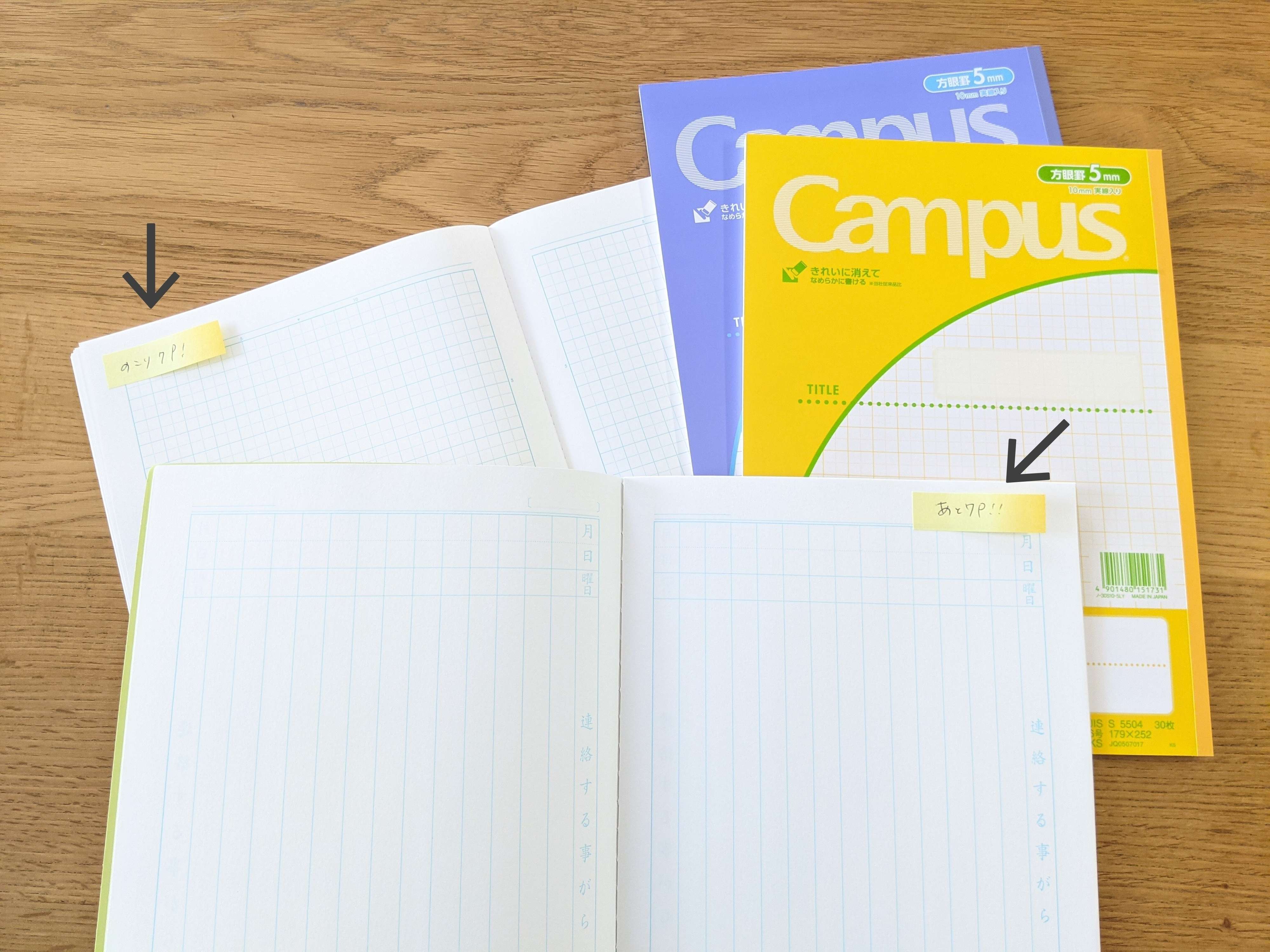そして、急になくなりがちな学習ノートや連絡帳は、たとえ日曜日の夜に言われても翌週末に購入すれば間に合うくらいのページに付せんを貼っておきます。
