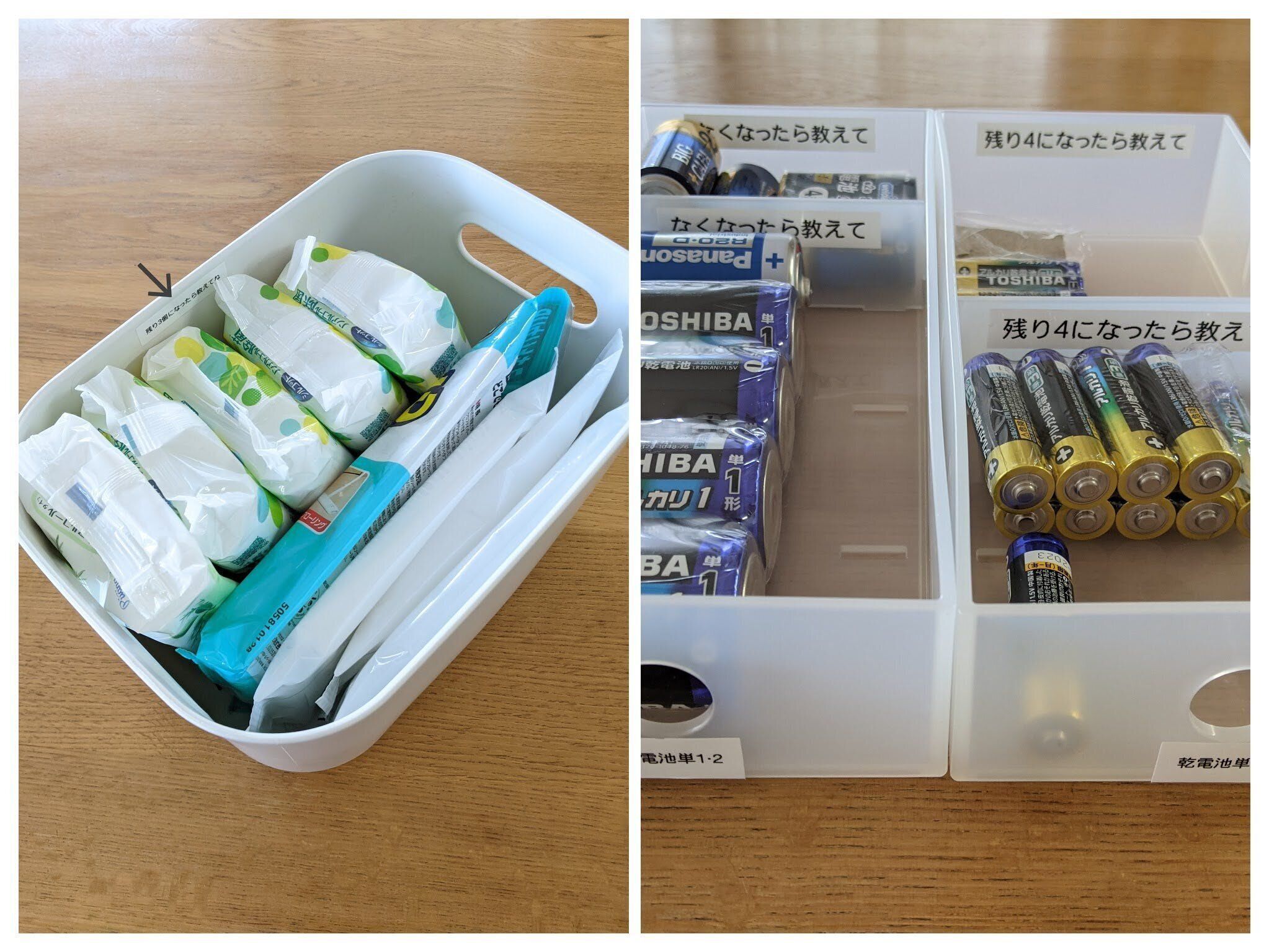 そこで、必要なものを手に取るとき目につく場所に、いつのタイミングで伝えてほしいか記載しておくことをおすすめします。それぞれの収納場所に「残り〇個になったら教えてね」といったように書いておきます。