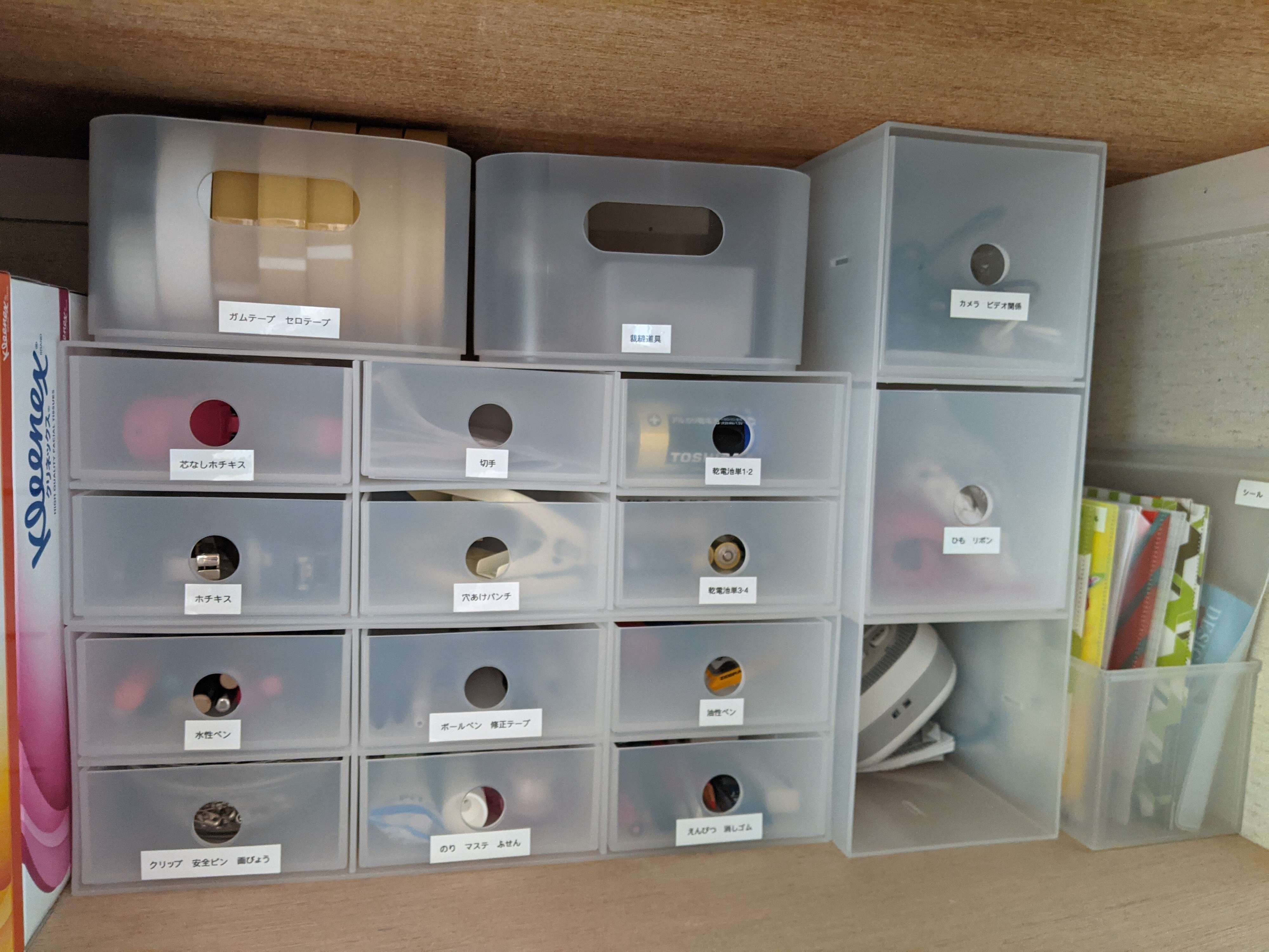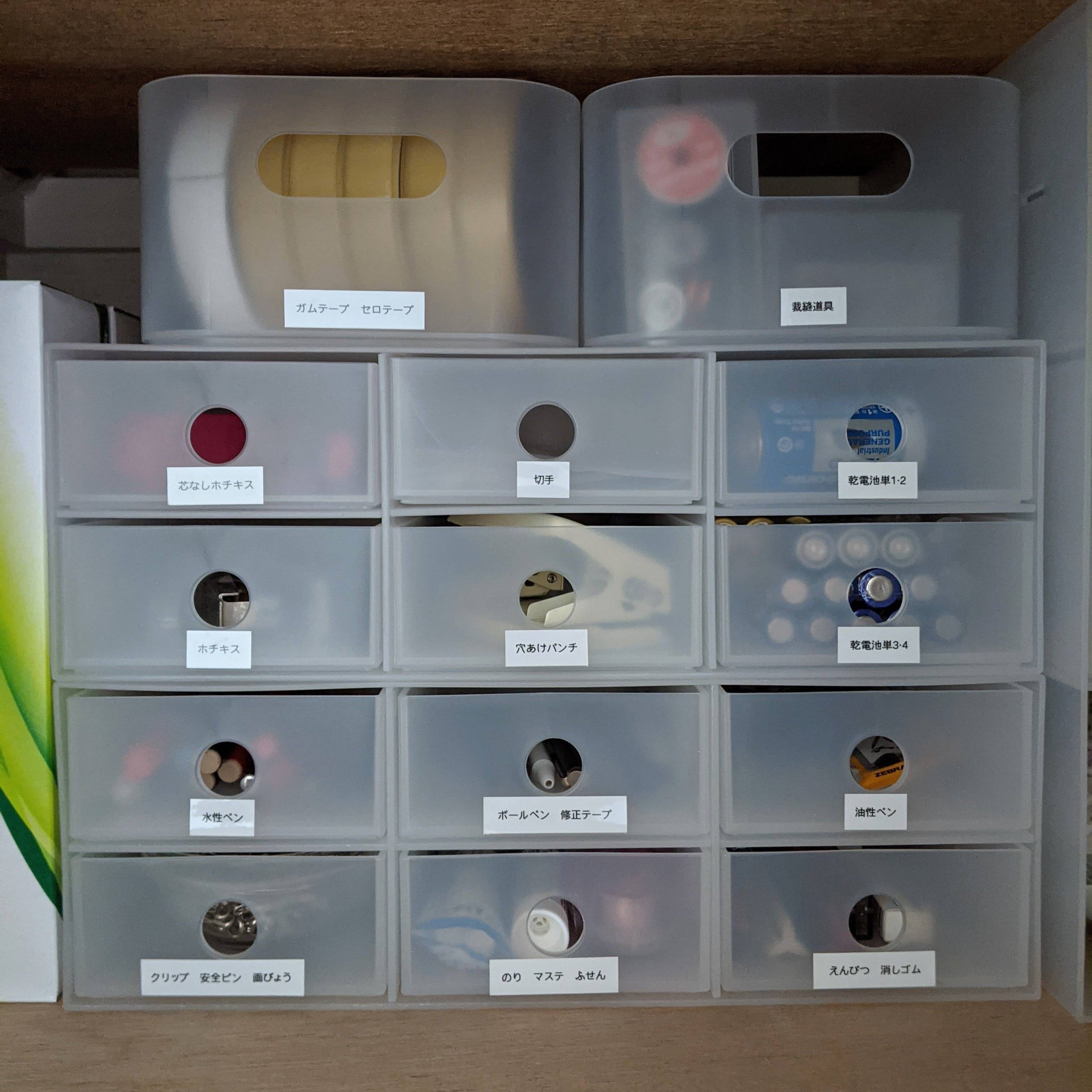 また、なるべく1つの引き出しには1アイテムを入れる、もし複数アイテム入れる場合は、鉛筆と消しゴム、ボールペンと修正テープのように、関連性があるものを一緒にしたほうがわかりやすいです。